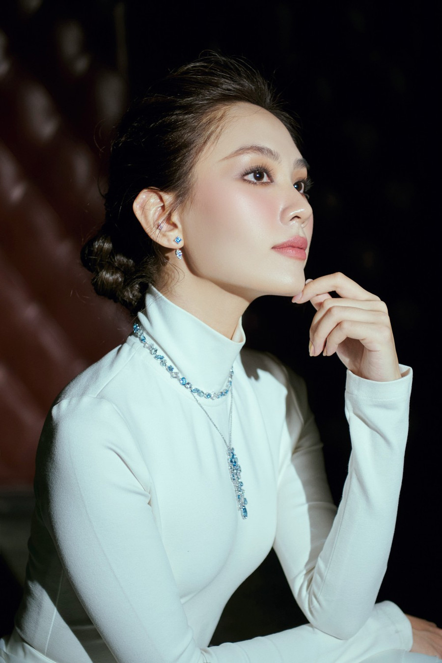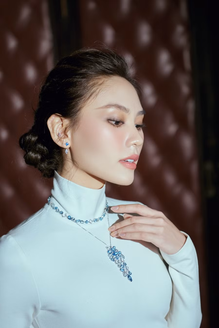 Xuất hiện với vai trò khách mời, đại diện công bố và trao giải thưởng cho Hạng mục Điện ảnh, Mai Phương tinh tế chọn cách búi gọn tóc thay vì những kiểu tóc xõa dài bồng bềnh, uốn cong thường thấy. Điểm nhấn của tổng thể có phần tối giản các chi tiết, Miss World Vietnam 2022 lựa chọn bộ trang sức vòng cổ, hoa tai đá xanh lam làm điểm nhấn vô cùng quý phái.