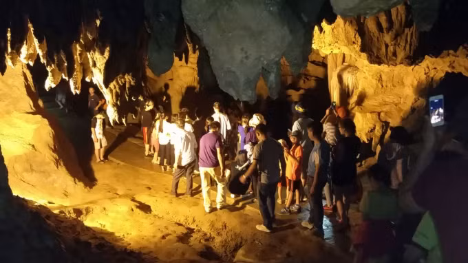 | Nhiều du khách tranh thủ chụp ảnh bên trong động để lưu làm kỷ niệm. |
