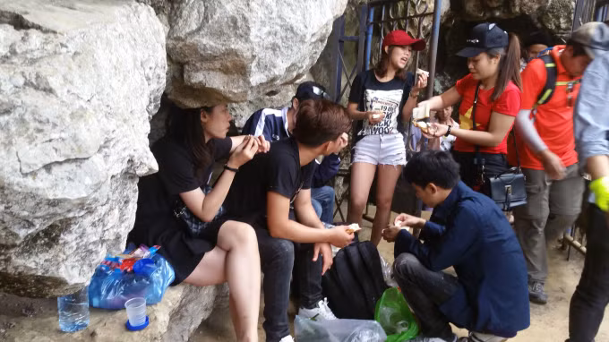 | Nhiều gia đình tranh thủ nghỉ ngơi, ăn uống để tiếp tục hành trình thăm thú. |