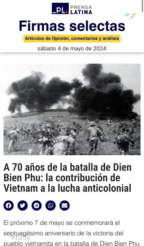 Đây là nhận định của Tiến sỹ Chính trị học Sergio Rodríguez Gelfenstein, nguyên Giám đốc Quan hệ Quốc tế của Phủ Tổng thống Venezuela, trong bài viết đăng tải trên Đặc san của Hãng thông tấn Mỹ Latinh Prensa Latina (Cuba) nhân dịp kỷ niệm 70 năm Chiến thắng Điện Biên Phủ (7/5/1954-7/5/2024).