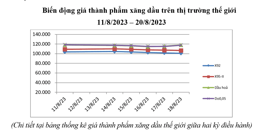 Theo Bộ Công thương, thị trường xăng dầu thế giới kỳ điều hành lần này (từ ngày 11/8/2023-20/8/2023) chịu ảnh hưởng của các yếu tố như: những lo ngại xoay quanh hoạt động kinh tế yếu của Trung Quốc, sự tăng giá của đồng USD, dự trữ dầu thô của Mỹ giảm, Trung Quốc sử dụng dầu dự trữ để ngăn chặn việc OPEC+ cắt giảm nguồn nhằm đẩy giá dầu đi lên… Các yếu tố nêu trên khiến giá xăng dầu từ ngày 11-8 đến 20-8 có biến động tăng giảm đan xen.