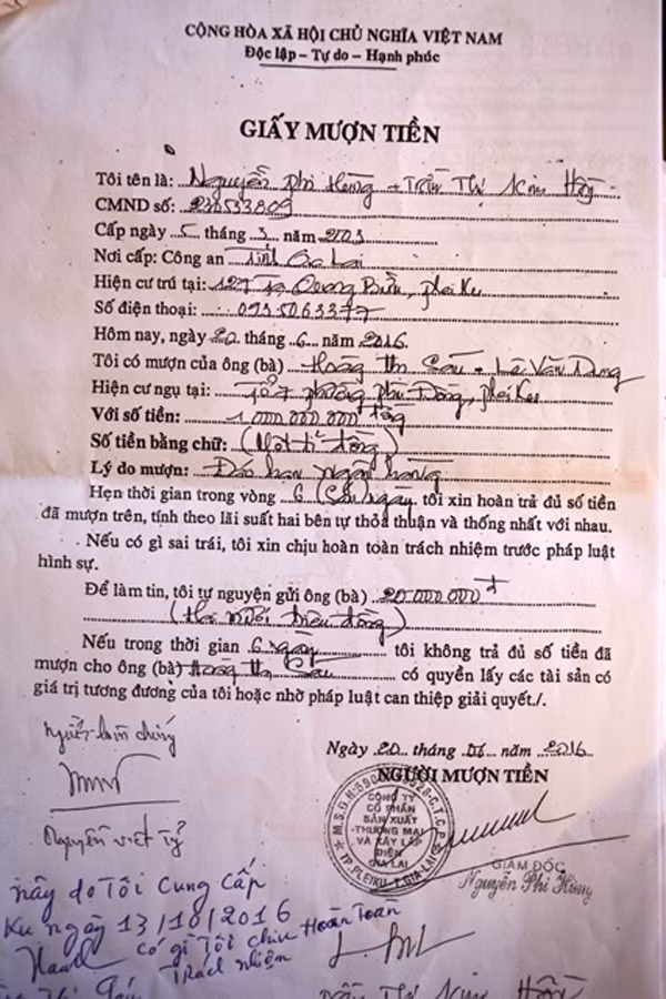 Bà Hoàng Thị Sáu (trú tại phường Phù Đổng, TP. Pleiku) bức xúc làm đơn tố giác trò “ảo thuật” của ông Nguyễn Phi Hùng (SN 1965) cùng vợ là bà Trần Thị Kim Hồng (SN 1971, trú tại phường Hội Thương, TP. Pleiku) để “ẵm” 700 triệu đồng của bà. Theo đó, do quen biết nên giữa tháng 6-2016, vợ chồng ông Hùng ngỏ ý mượn bà Sáu 1 tỷ đồng để đáo nợ ngân hàng. Ngày 20-6-2016, bà Sáu và vợ chồng ông Hùng đã lập giấy mượn tiền và hẹn sau 6 ngày sẽ hoàn trả đủ số tiền gốc cùng tiền lãi như thỏa thuận. Để tạo lòng tin với bà Sáu, ông Nguyễn Phi Hùng còn mang cả con dấu của Công ty cổ phần Sản xuất Thương mại và Xây lắp Điện Gia Lai-nơi ông Hùng làm Giám đốc để đóng vào giấy mượn tiền.