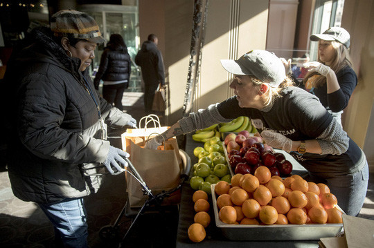 Một nhân viên liên bang, tạm nghỉ việc vì chính phủ Mỹ đóng cửa, nhận trái cây tại một sự kiện hỗ trợ ở thủ đô Washington hôm 22-1 Ảnh: AP