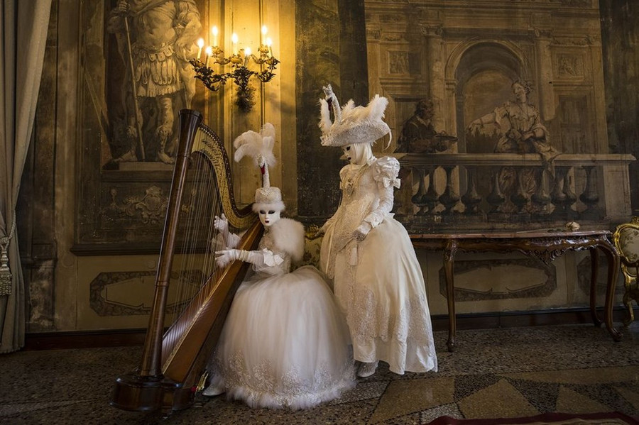 Hai người đeo mặt nạ hóa trang và mặc trang phục truyền bên chiếc đàn trong cung điện tại lễ hội Carnival ở Venice, Italy.