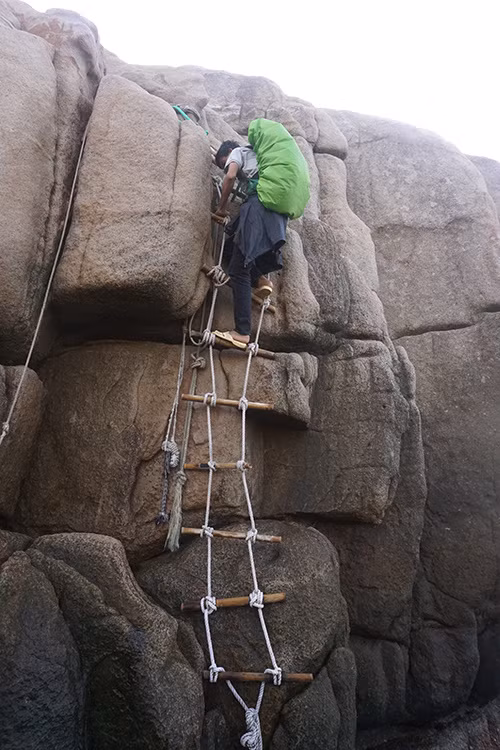 Chóp cực Đông nằm trên một tảng đá nguyên khối lớn, để lên được đỉnh chóp, bạn tiếp tục đu theo dây có sẵn và leo lên.