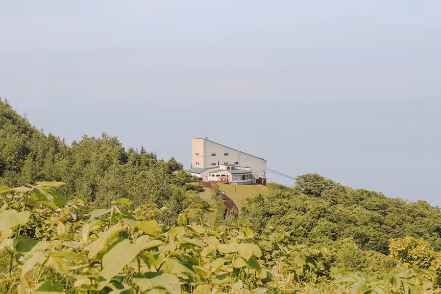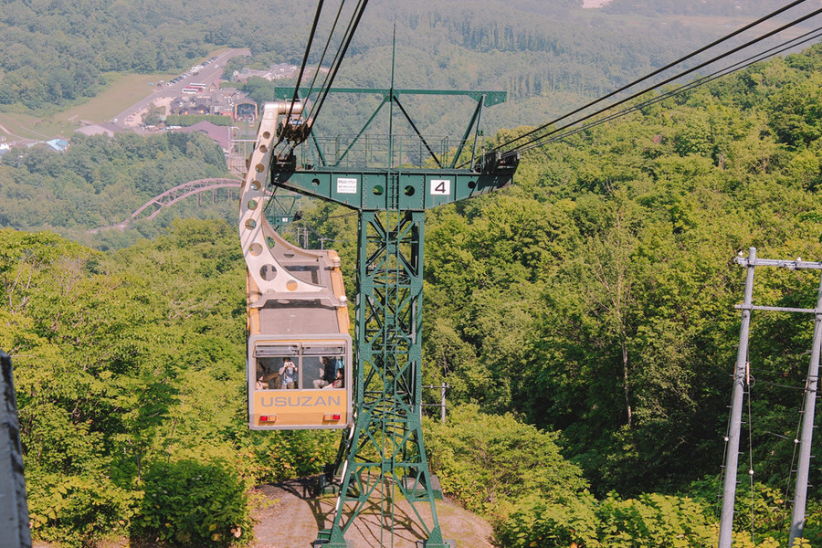 Tôi đi lên Usuzan Ropeway và tới trạm đầu chỉ sau gần 10 phút. Từ bên trong Usuzan Ropeway, tôi ngắm nhìn ngọn núi Showa-shinzan phía xa đang đắm mình bên dưới ánh mặt trời tháng 7.