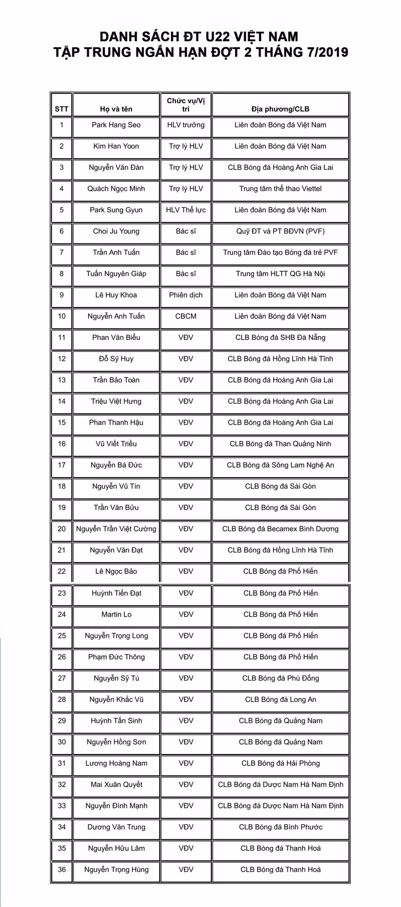 HLV Park Hang Seo tiếp tục thực hiện kế hoạch kiểm tra, đánh giá và tuyển chọn lực lượng cho U22 Việt Nam hướng tới SEA Games 30 với quyết định triệu tập thêm nhiều gương mặt mới trong đợt tập trung ngắn hạn lần thứ hai của tháng 7/2019.