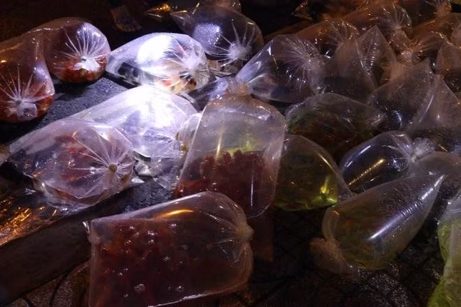 Người bán phân loại hàng trăm loại cá cảnh rồi đựng cá vào các túi ni lông, để xuống vỉa hè, lề đường một cách ngăn nắp. Kim đồng hồ chỉ 4 giờ, phiên chợ tấp nập hơn, khách hàng rọi đèn, cúi người xuống chọn lựa.