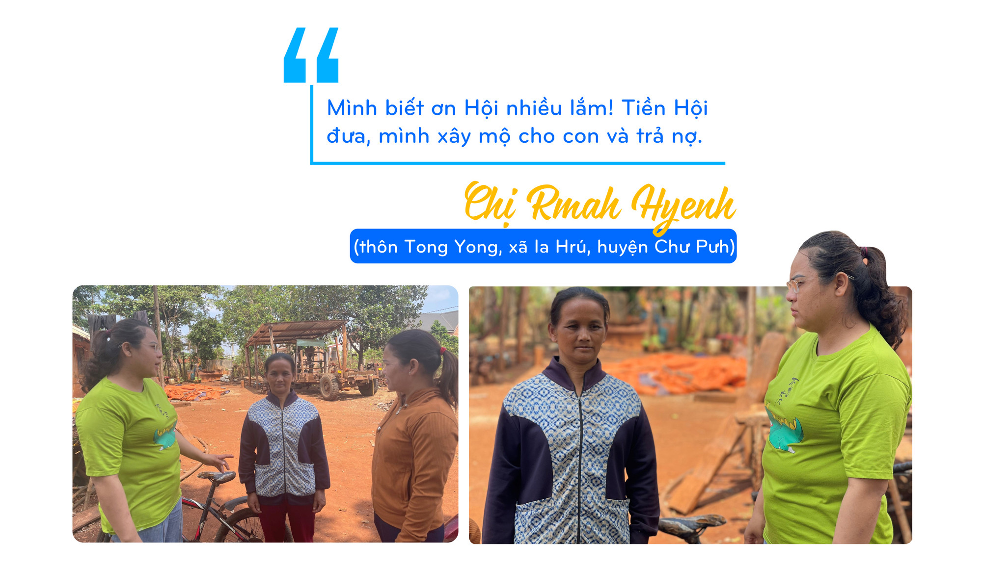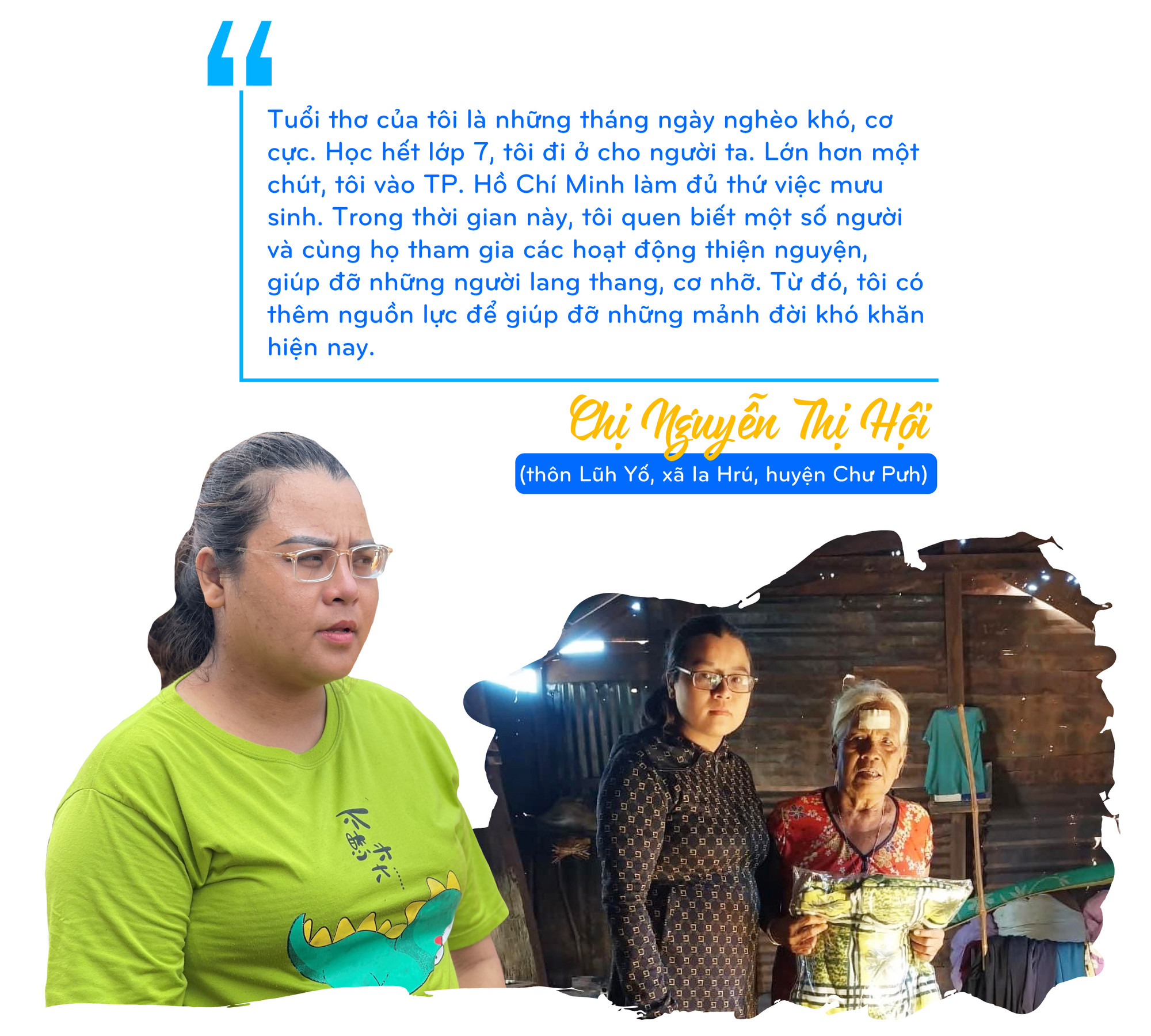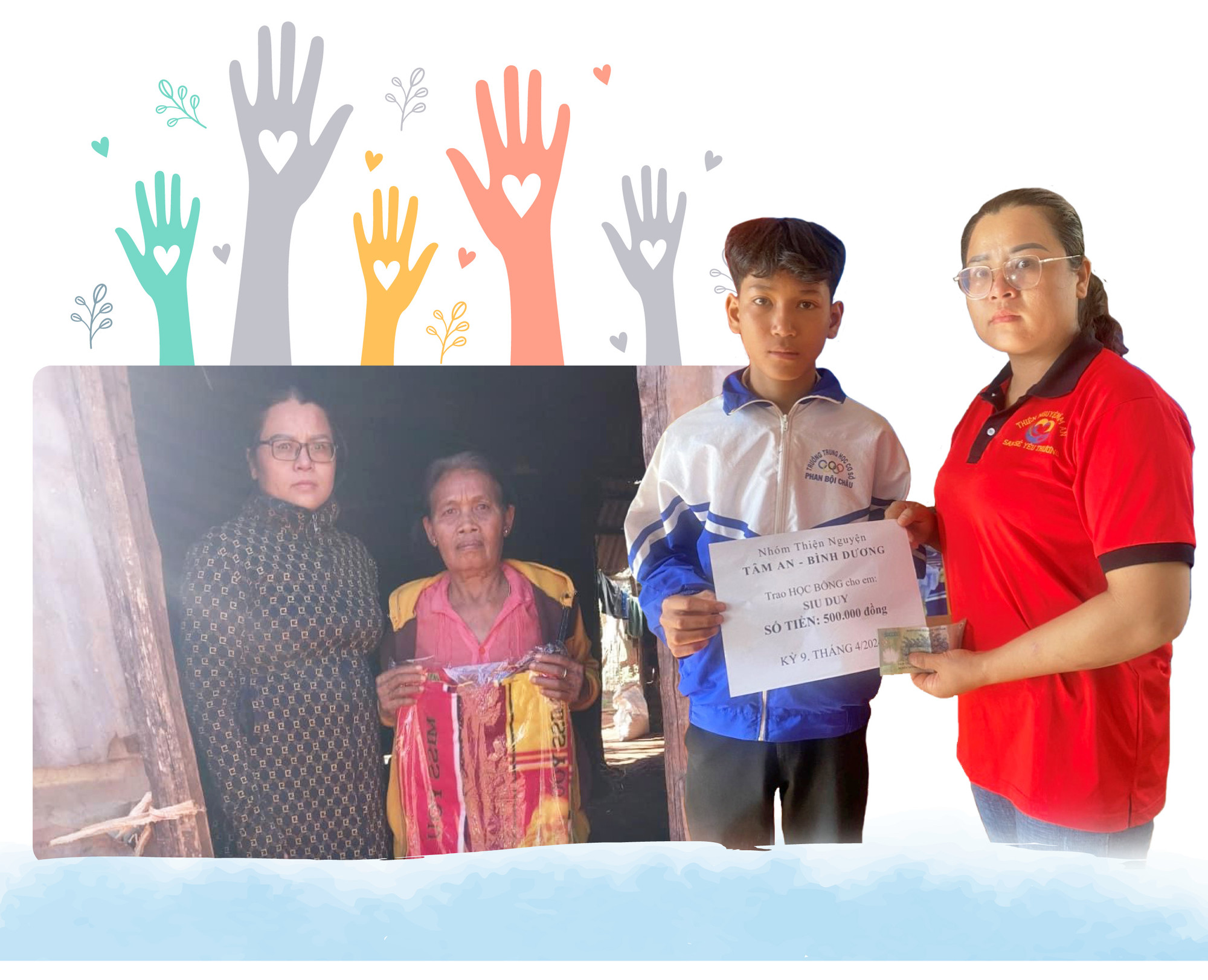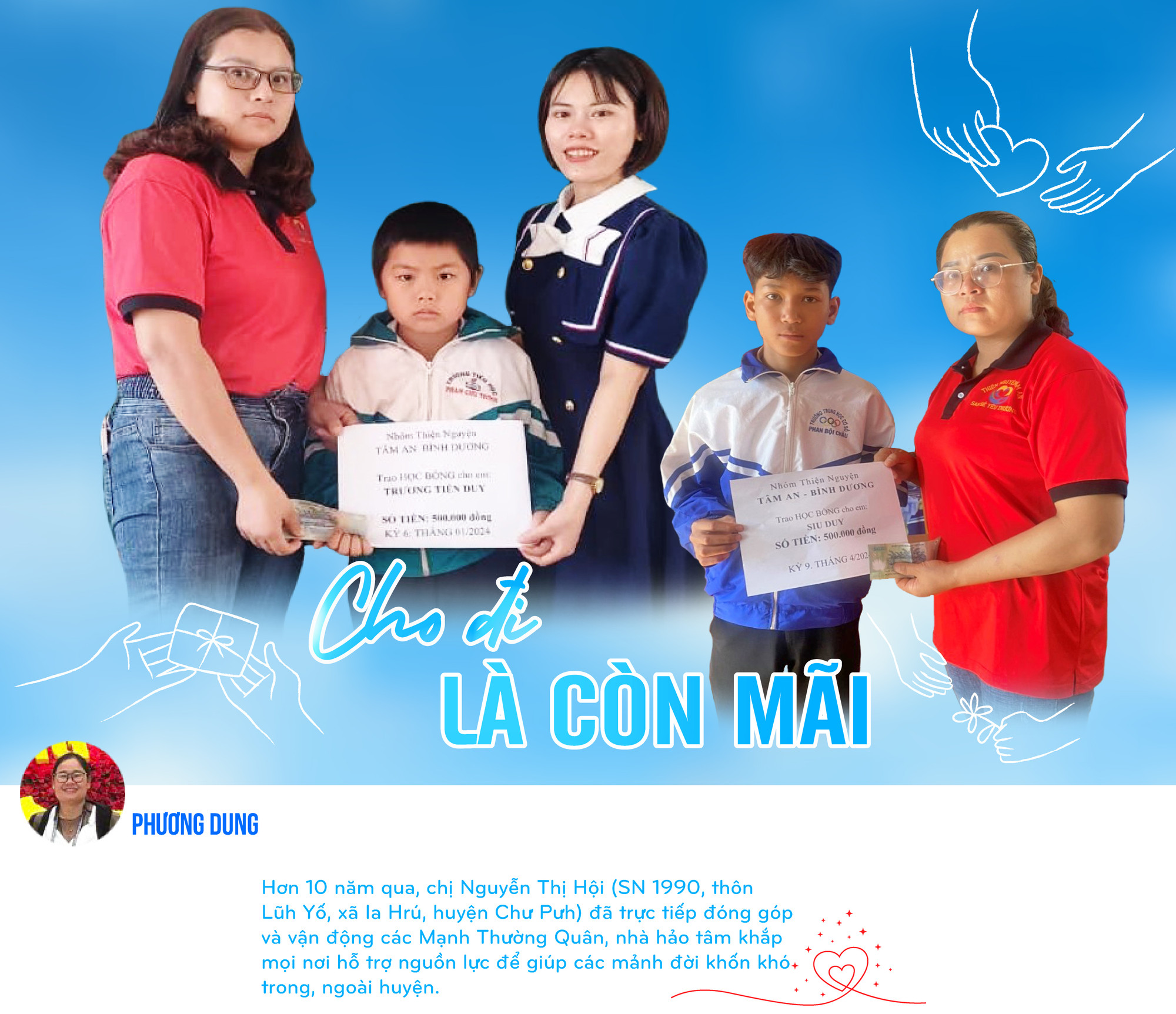 Từ năm học 2023-2024, chị kết nối với nhóm thiện nguyện Tâm An Bình Dương nhận hỗ trợ 16 em học sinh có hoàn cảnh khó khăn, mồ côi cha mẹ. Trong đó có 10 em ở xã Ia Blứ và 6 em ở xã Ia Hrú. Nhóm thiện nguyện Tâm An Bình Dương hỗ trợ 500 ngàn đồng/em cho đến khi các em hoàn thành chương trình THPT. Đón nhận số tiền 500 ngàn đồng chị Hội trao hỗ trợ cho em trai Siu Duy trong tháng 8, chị Siu H’Quang (thôn Tong Yong) phấn khởi nói: “Có số tiền này, em mình sẽ yên tâm đến lớp. Mình chỉ dùng để mua thêm đồ dùng học tập và các thứ cần thiết cho em”.