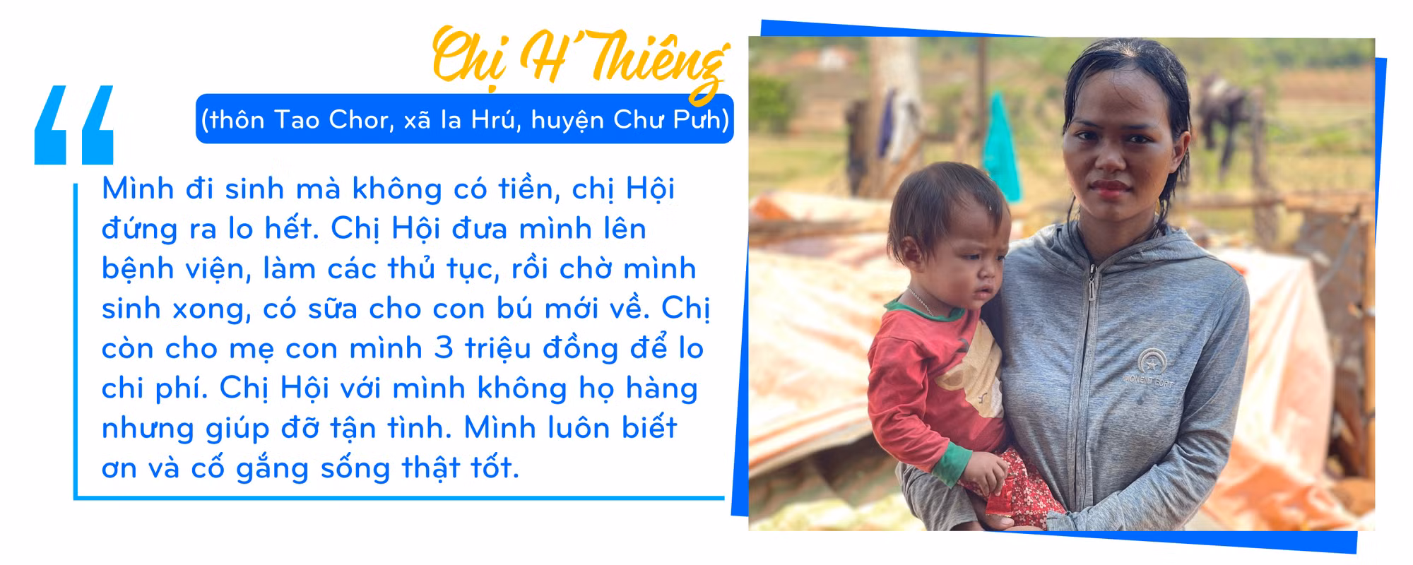 Chồng mất vì tai nạn giao thông khi chị H’Thiêng mang thai đứa con đầu lòng ở tháng thứ 8. Trong lúc suy sụp vì mất đi bạn đời, chị H’Thiêng may mắn vì luôn có gia đình, người thân và chị Hội cạnh bên an ủi, giúp đỡ. Chị dần nguôi nỗi đau và thuận lợi khi “mẹ tròn con vuông” lúc sinh con. Ôm con gái 22 tháng tuổi vào lòng, chị H’Thiêng cảm kích nói: