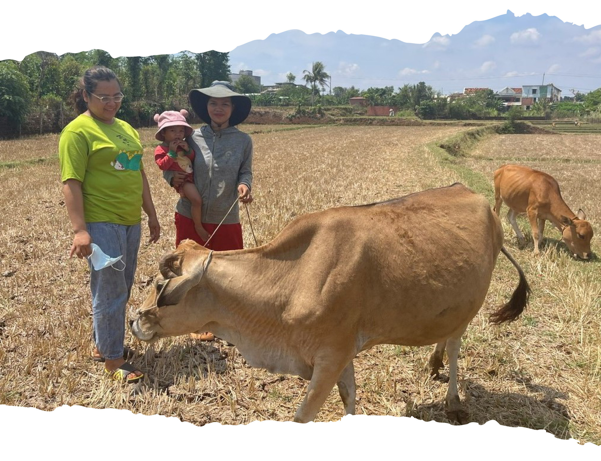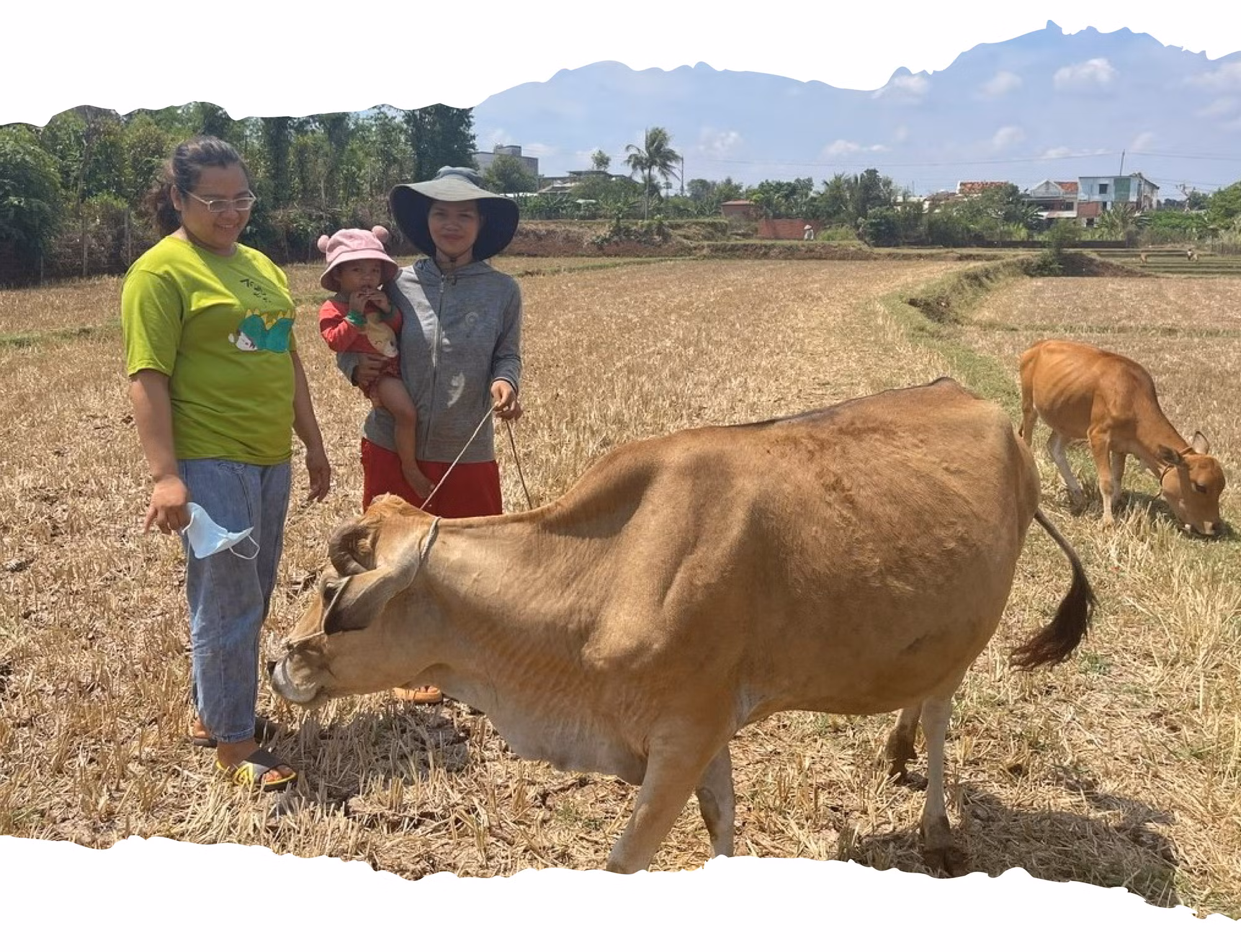 Giữa trưa nắng, chúng tôi men theo con đường đất nhỏ hẹp, hai bên là rẫy cà phê để đến thăm mẹ con chị H’Thiêng ở thôn Tao Chor, xã Ia Hrú. Ngôi nhà tôn thấp, nhỏ đơn độc giữa đồng. Rải chiếc chiếu sờn cũ xuống nền đất bên hông nhà, chị H’Thiêng trò chuyện: Ngồi ngoài này có gió thổi cho mát chứ trong nhà nóng lắm! Rồi chỉ tay về phía con bò đang tha thẩn ở khoảnh ruộng còn trơ gốc rạ ở phía xa, chị tiếp lời: “Gia tài của 2 mẹ con chỉ có sào ruộng và 1 con bò thôi. Ruộng thì bố mẹ cho, bò là chị Hội hỗ trợ. Ngồi đây, mình quan sát được hết”.