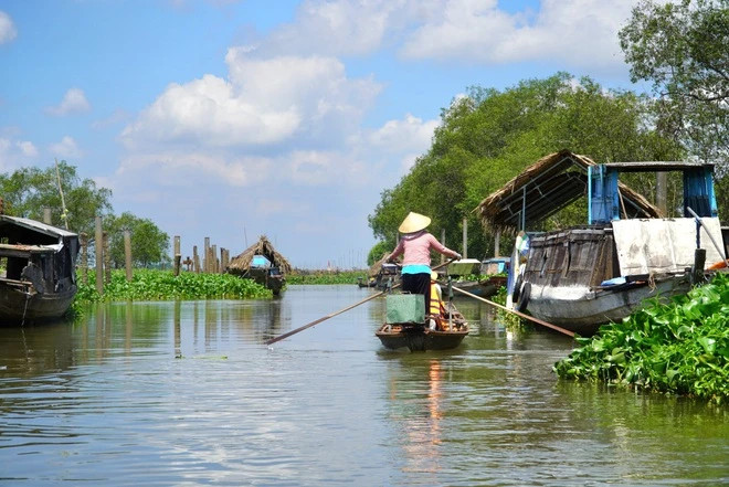 | Trải nghiệm tham quan chợ nổi Tân Phong bằng xuồng. Ảnh: THANH NAM |
