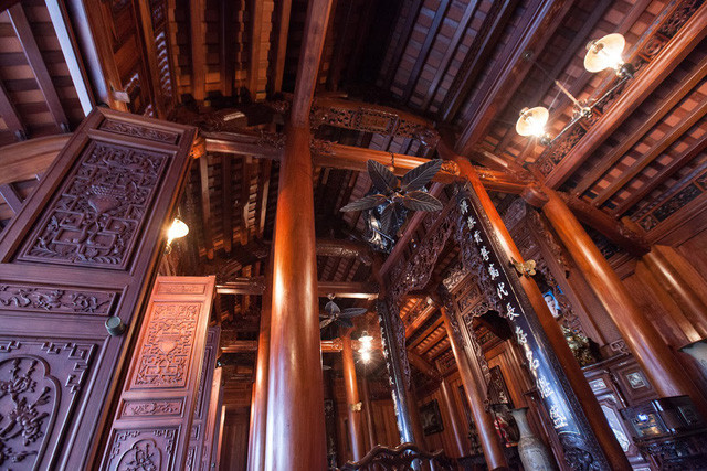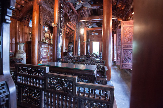 Nhà được làm hoàn toàn bằng gỗ lim quý hiếm và phải mất gần hai năm với khoảng 40 thợ ở Chàng Sơn - làng nghề nổi tiếng bậc nhất Hà Nội về làm mộc cổ truyền thực hiện. Các cánh cửa được chạm trổ cầu kỳ, tinh xảo với hoa văn: tùng, cúc, trúc, mai…