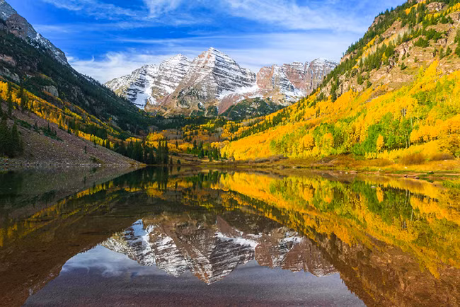 Vùng Maroon Bells-Snowmass ở Wilderness, Colorado: Đây thực sự là một vùng đất tự nhiên đẹp tuyệt vời. Nằm sâu trong dãy núi Elk của miền Trung Colorado. Cách xa các khu dân cư gần 160km đường bộ trên những con đường mòn, thành phố gần với vùng hoang dã như ở thế giới khác này là Aspen. Toàn bộ khu vực như huyền thoại này trải dài hơn 73.248ha với thung lũng phủ đầy cây cối tràn ngập màu sắc rực rỡ và những đỉnh núi phủ đầy tuyết. Thật là một thiên đường cho du khách.