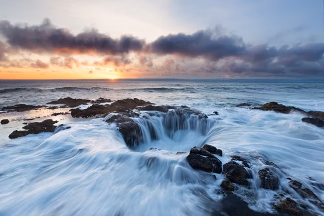 Giếng thần sấm Thor's Well ở Oregon: Với vẻ đẹp đầy hấp dẫn “cổng địa ngục” trông rất bí ẩn và đầy hiểm nguy. Tuy nhiên, nó chỉ sâu khoảng 6m, và lỗ hút đó được tạo ra khi thủy triều lên, những con sóng sẽ đẩy nước biển vào trong giếng. Sau đó, nước biển dần bị đẩy ra ngoài theo ảnh hưởng của áp lực thủy triều. Cảnh tượng ngoạn mục này thu hút rất nhiều du khách kéo đến chiêm ngưỡng mỗi năm.