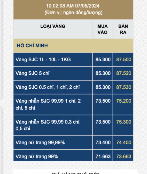 Trước đó, vào đầu giờ sáng ngày 7-5, giá vàng miếng SJC được Công ty SJC niêm yết mua vào 84,6 triệu đồng/lượng, bán ra 86,8 triệu đồng/lượng, tăng thêm 300.000 đồng/lượng so với hôm qua. Nếu tính trong 2 ngày qua, giá vàng miếng SJC đã tăng gần cả triệu đồng/lượng.