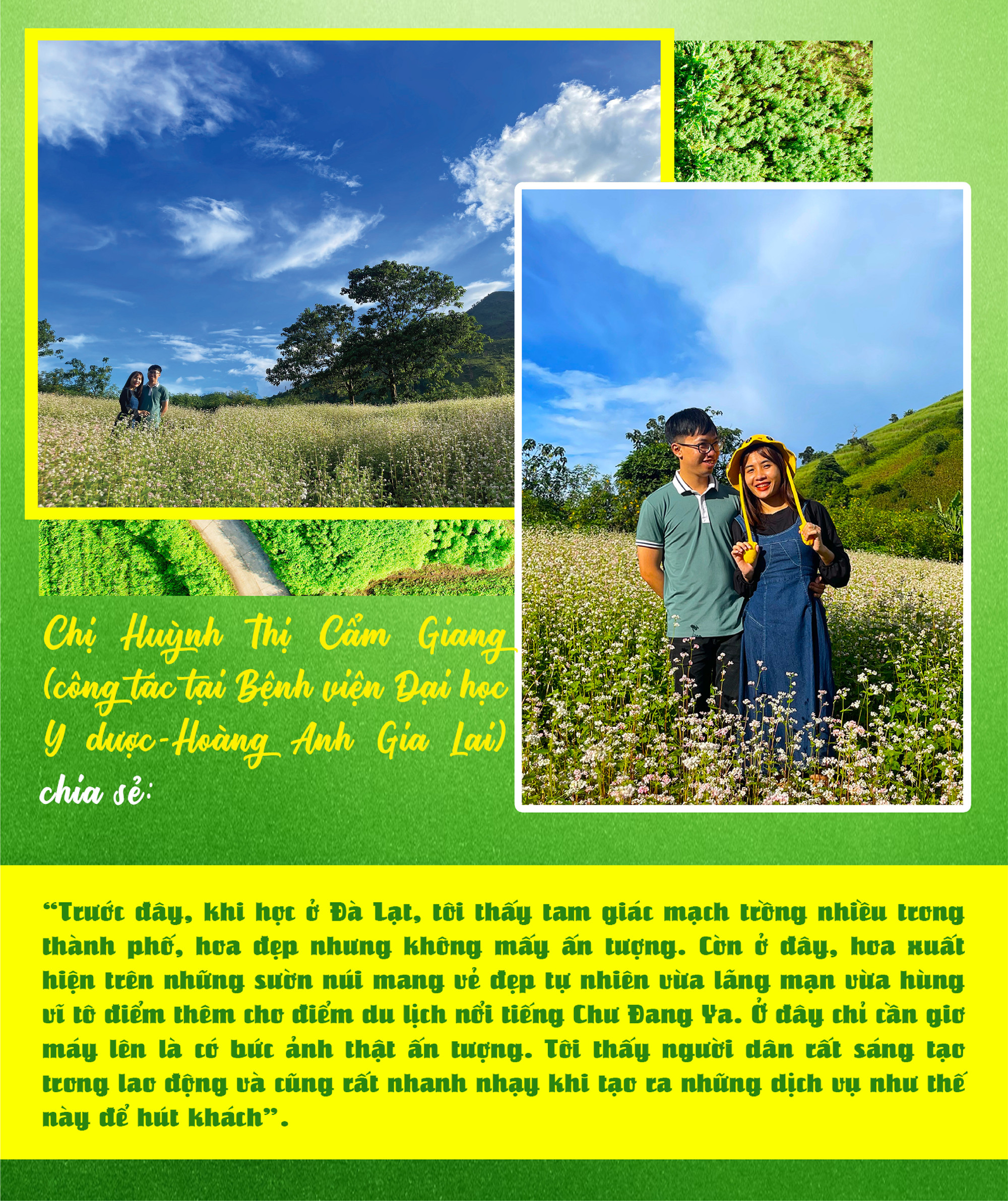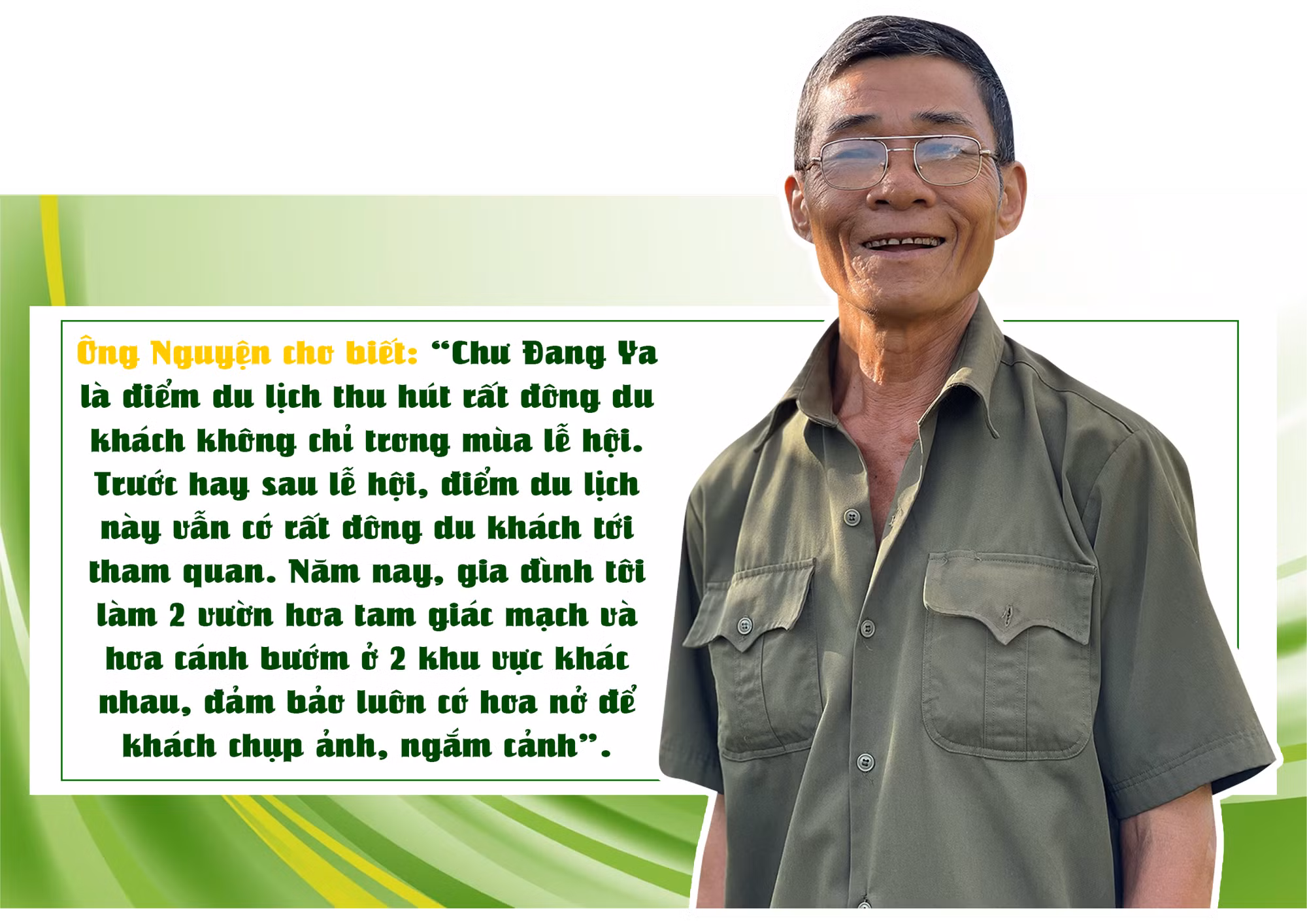 Một nông dân khác là ông Thái Văn Nguyện (làng Kó) cũng kịp trồng vườn hoa tam giác mạch rộng 4 sào ngay trên đường lên núi lửa Chư Đang Ya để đón đầu mùa lễ hội năm nay. Ngay từ giữa tháng 10, vườn hoa đã thu hút rất đông người dân và du khách tham quan bởi vẻ đẹp cộng hưởng của hoa tam giác mạch với địa hình núi non trùng điệp. Nhìn từ trên cao, vườn hoa được kỳ công tạo hình với điểm nhấn trên cùng là hình lá cờ, phía dưới là biểu tượng Olympic với 5 vòng tròn đan cài vào nhau, dưới cùng là tạo hình chữ “VIET NAM” đầy tự hào. Mùa lễ hội năm trước, ông Nguyện cũng là người đã có sáng kiến trồng vườn hoa cánh bướm tạo hình đôi nam nữ nắm tay say đắm trong vũ điệu Samba sôi động-điệu nhảy đặc trưng của lễ hội-thu hút du khách tới chụp ảnh.