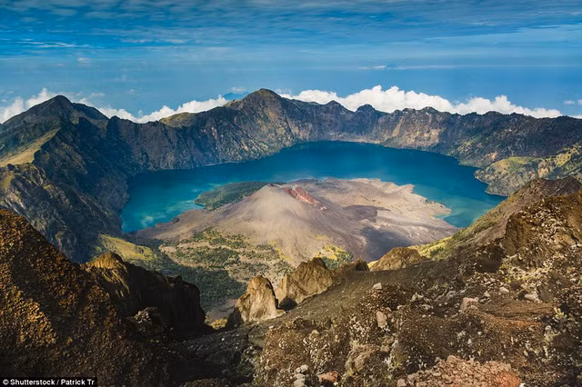 Cảnh quan hùng vỹ được chụp xung quanh núi lửa Rinjani trên đảo Lombok của Indonesia. Vùng nước xanh đục của hồ nước ở miệng núi lửa và khối đá màu đỏ ở đỉnh núi đang hoạt động có thể nhìn thấy được.