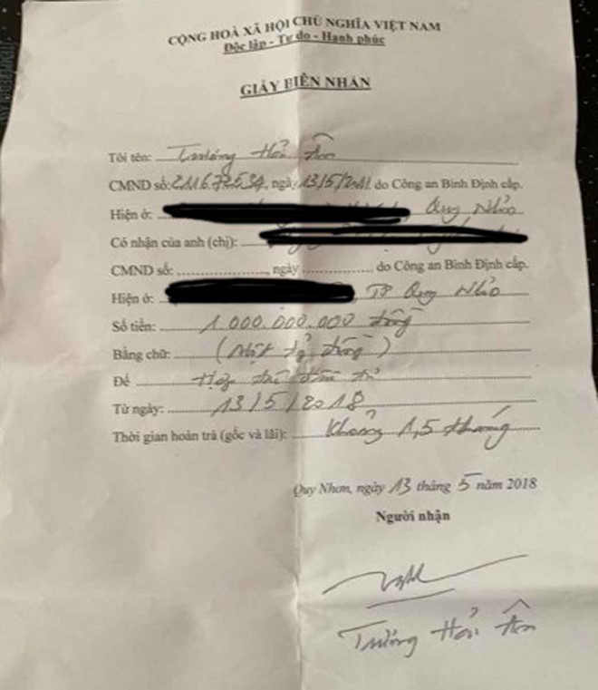Giấy nhận tiền được cho là có chữ ký của ông Trương Hải Ân. ẢNH: HOÀNG TRỌNG