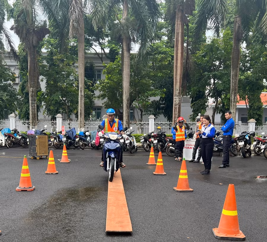 Cùng với đó, hướng dẫn đoàn viên của Công ty TNHH một thành viên Toàn Trung thông tin về tình hình tai nạn giao thông, nguyên nhân và hậu quả do tai nạn giao thông gây ra; trang bị cho đoàn viên, thanh niên một số kiến thức, kỹ năng lái xe an toàn như: Hướng dẫn kiểm tra mũ bảo hiểm đảm bảo chất lượng, cách đội mũ bảo hiểm đúng quy định; cách kiểm tra thắng (phanh), đèn xe an toàn trước khi tham gia giao thông. Ngoài ra, tổ chức cho đoàn viên, thanh niên tham gia các trò chơi đố vui có thưởng và thực hành kỹ năng lái xe thăng bằng trên ván hẹp.