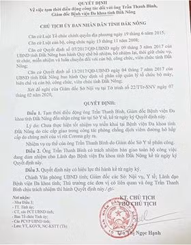 Quyết định tạm điều chuyển công tác đối với ông Trần Thanh Bình - Giám đốc Bệnh viện Đa khoa tỉnh Đắk Nông.