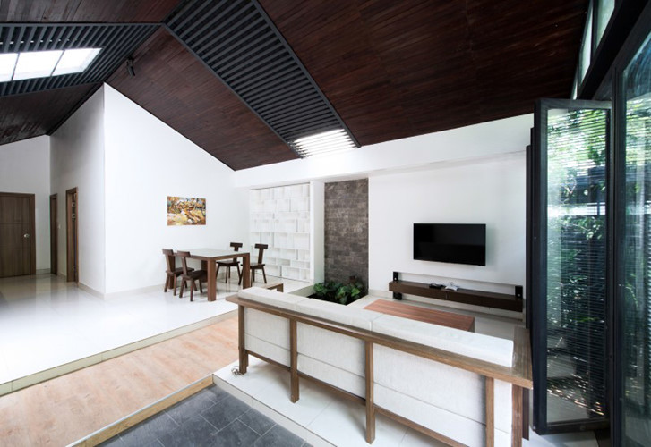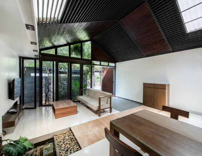 Phòng khách và phòng ăn ngăn cách nhau bằng tiểu cảnh sân vườn với cây xanh, hồ nước nhỏ.