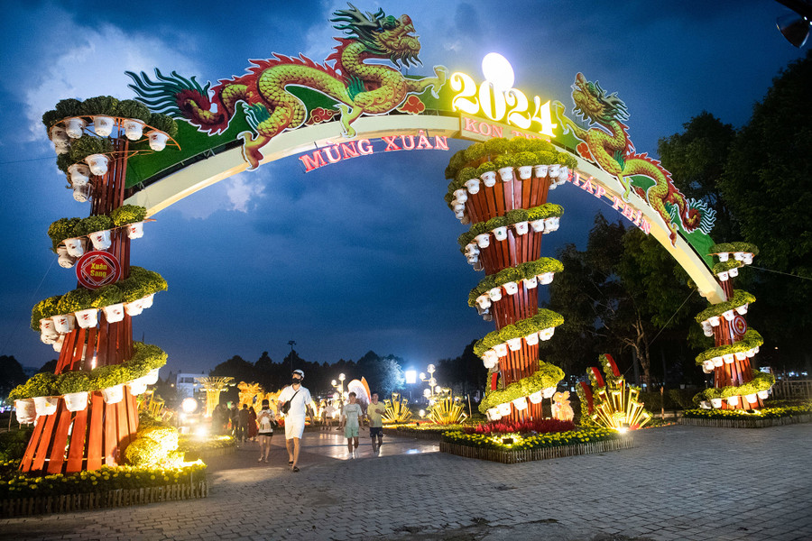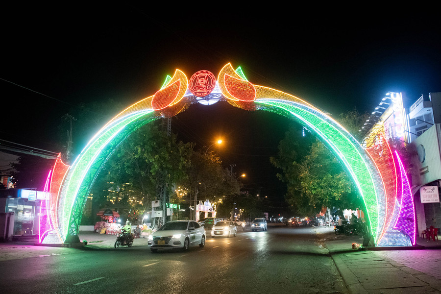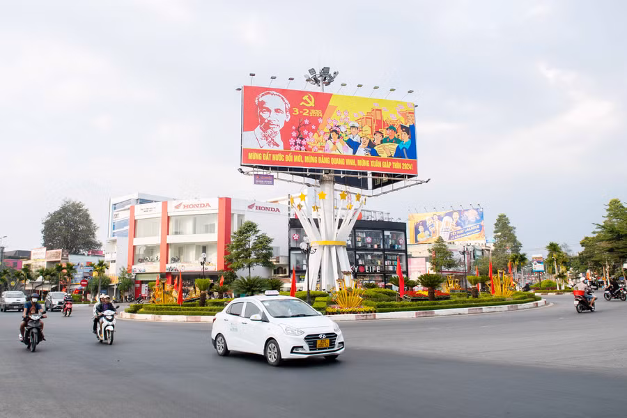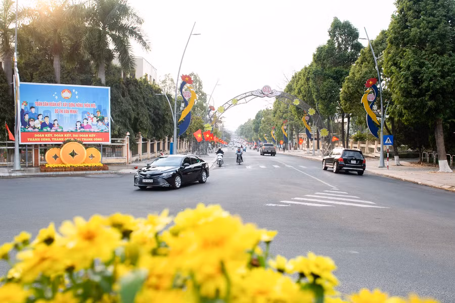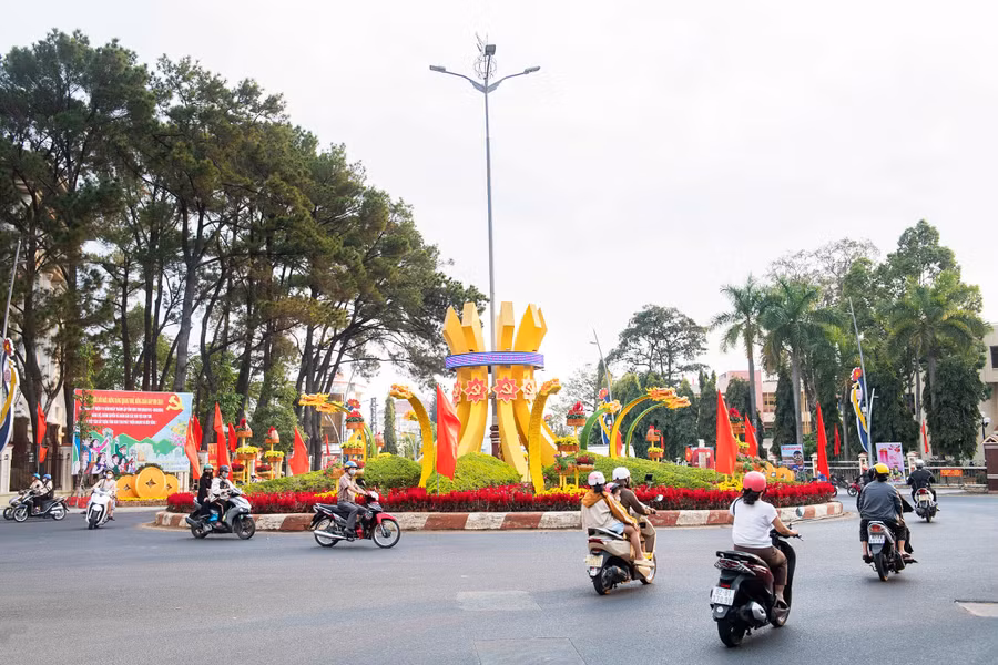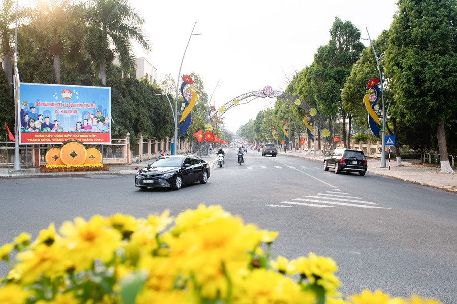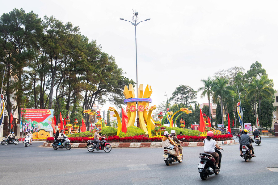 | Pa nô, cờ, hoa mừng Đảng, mừng Xuân tại bùng binh điểm giao cắt các tuyến đường lớn ở thành phố. |