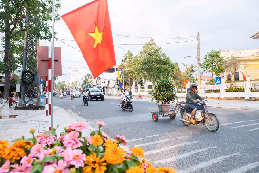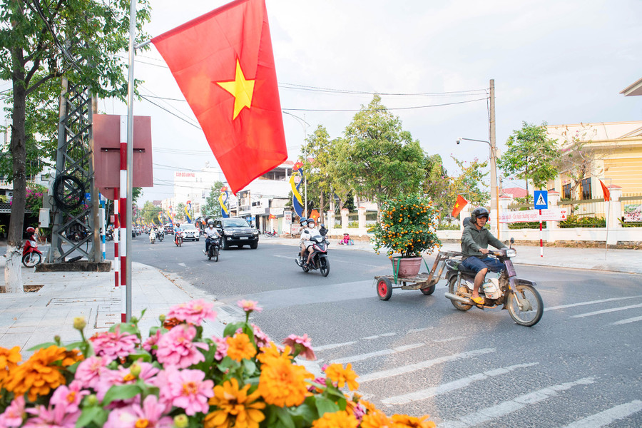| Cờ Tổ quốc treo thẳng hàng, rực đỏ khắp dãy phố. |