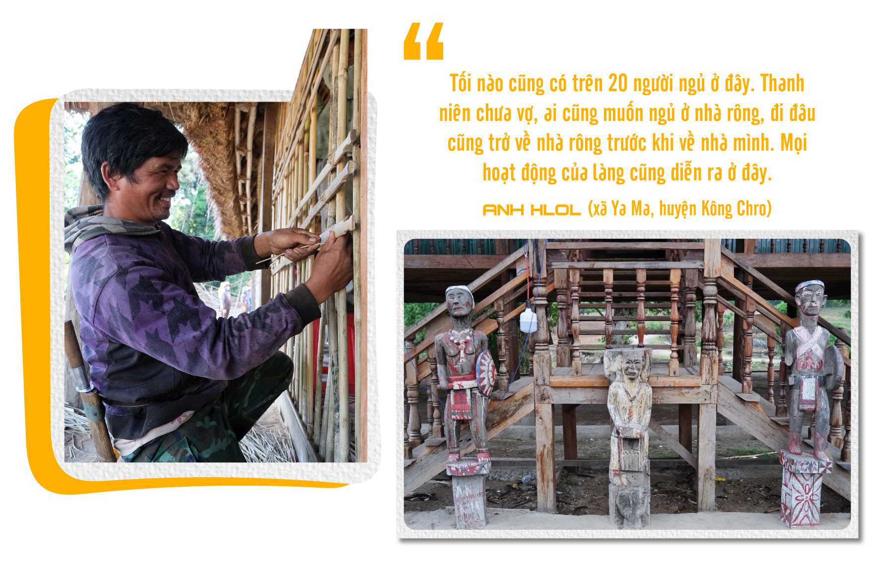 Những cái mới đã làm thay đổi diện mạo ngôi nhà rông. Nhưng còn đó bức tượng 2 người đàn ông mặc trang phục truyền thống cầm khiên trong tư thế sẵn sàng bảo vệ ngôi nhà chung của làng. Bên trong nồng đượm hơi người, đem đến sự thân thuộc trong không gian sinh hoạt cộng đồng. Chiều mưa, đứng bên hiên nhà, có thể quan sát gần như trọn vẹn nhịp sống chậm rãi vốn có của làng. Bà con đi làm rẫy trở về, dẫn theo con nhỏ thong dong trên các ngả đường. Những đứa trẻ điềm nhiên chơi bóng trong mưa trước sân nhà rông.