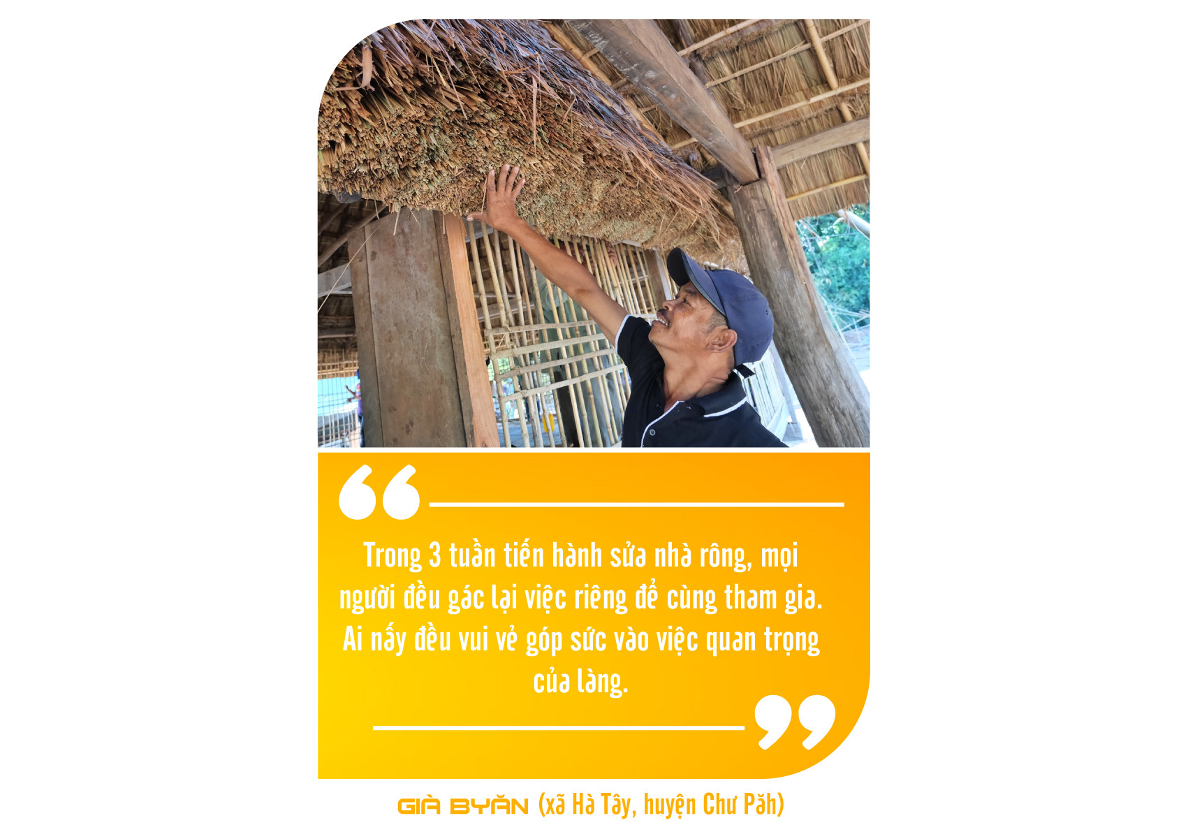 Già Byăn cho biết: Nhà rông được làm từ cuối năm 2011. Đến năm 2015, làng sửa chữa lần đầu tiên. Đây là lần thứ hai làng sửa nhà rông với sự chung tay góp sức của cả cộng đồng. Toàn bộ nguyên vật liệu đều do người dân đóng góp. Phụ nữ trong độ tuổi lao động góp 10 bó tranh, đàn ông thì góp tre nứa, dây mây. Tất cả dân làng đều góp ngày công sửa nhà. Vì vậy, việc chung tay sửa chữa ngôi nhà rông thể hiện sức mạnh cộng đồng và tiềm lực to lớn của làng trong việc tập hợp, đoàn kết người dân.