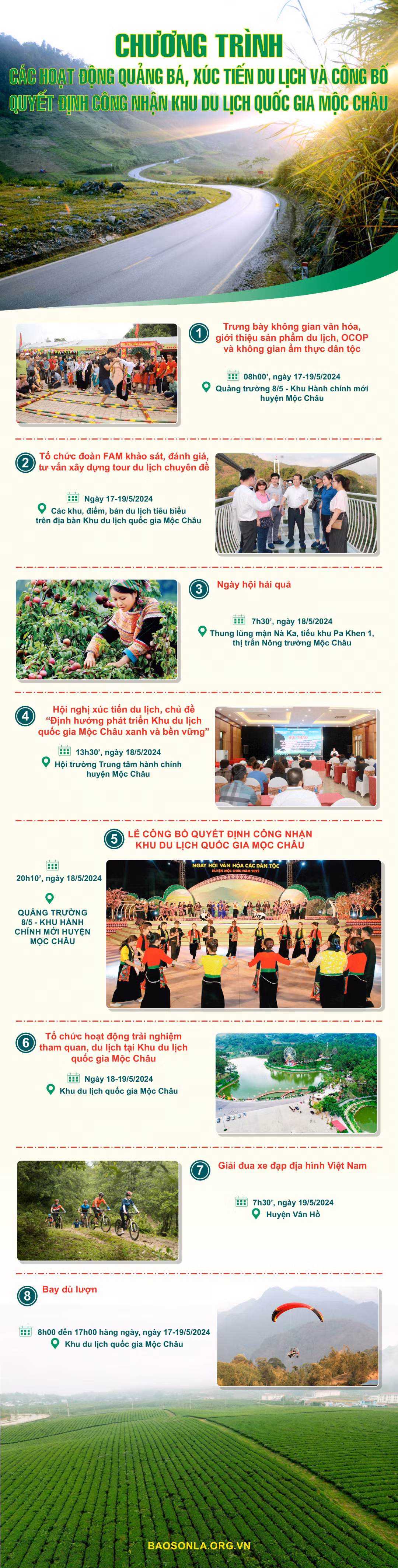 Infographic Chương trình các hoạt động quảng bá, xúc tiến du lịch và công bố quyết định công nhận Khu du lịch quốc gia Mộc Châu