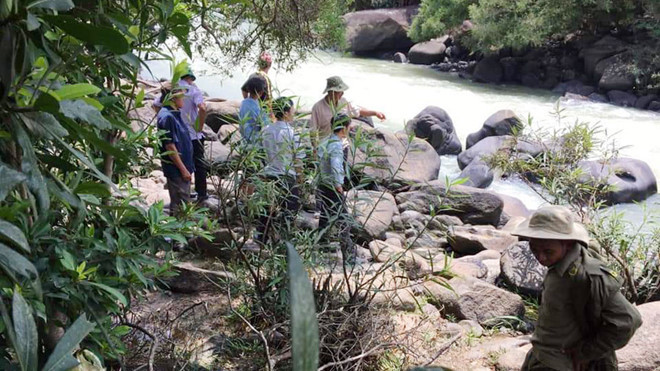 | Lực lượng cứu hộ tìm kiếm nạn nhân bị nước lũ cuốn trôi tại thác Liêng Ệp. ẢNH: TRÙNG DƯƠNG |