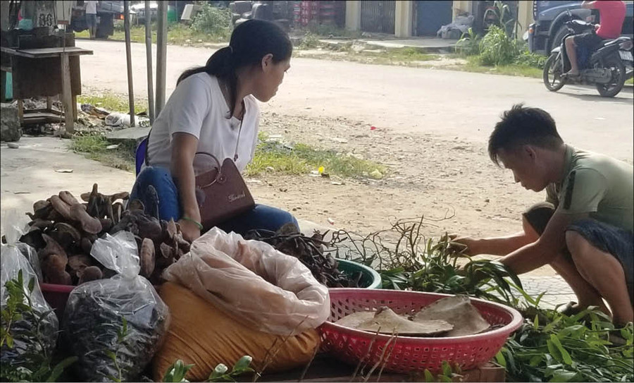 Bà Viên Thị Ngo (xã Bắc Sơn, huyện A Lưới) trải tấm bạt phủ lớp bụi mờ trên vỉa hè đường Hồ Chí Minh, vội đổ số dược liệu đựng trong a chói được chồng con lặn lội suốt cả tuần hái tận rừng sâu. Thoáng chốc, khoảng 3kg dược liệu được khách hàng hỏi mua.