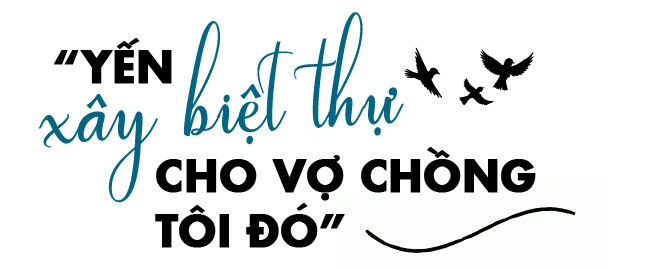 Có lẽ “nể tình” lắm nên bà Tuất mới cho tôi được “động phòng” chim yến. Qua ánh đèn pin, tôi sững sờ trước cảnh tượng trên trần nhà dày đặc tổ yến màu trắng. Nhiều chim mẹ đang ấp trứng, ủ con non giật mình bay lên kêu loạn xạ. Bà Tuất cho biết, hiện có hơn 3.000 tổ trong các nhà yến. Nhưng khi thu hoạch phải chọn những tổ yến đã đủ chuẩn và tuyệt đối không lấy những tổ mà yến đã làm nhưng chưa sinh con. Vì nếu như vậy yến mẹ sẽ đâm đầu vào tường... tự tử. Với số lượng tổ yến đạt chuẩn thu hoạch được, mỗi năm bà Tuất có thể thu về khoảng 6 tỉ đồng. Bà Tuất hớn hở giới thiệu căn biệt thự hoành tráng đang xây bên cạnh nhà yến và nói vui: “Yến xây biệt thự cho vợ chồng tôi đó”. Bà cũng tiết lộ thêm, con trai bà học Đại học Ngân hàng nhưng về đây lo kỹ thuật nuôi yến, con gái cũng theo nghề nuôi yến. Bà Tuất còn khoe với tôi la liệt giấy khen, bằng khen... từ cấp địa phương đến trung ương mà bà được trao tặng.