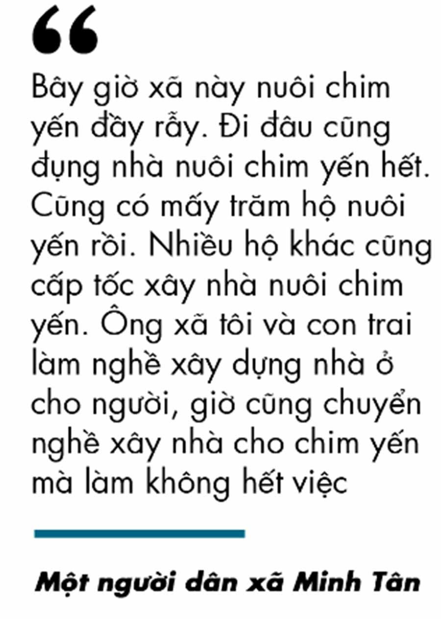 Tiếp xúc với Nguyễn Minh Thuận, vị phó chủ tịch trẻ của xã Minh Tân, anh cũng hào hứng nói về mô hình nuôi chim yến đang phát triển nhanh chóng ở đây. “Năm 2010 chỉ có một hộ nuôi chim yến, nhưng giờ đây thấy nuôi chim yến thu nhập cao nên đã có hàng trăm hộ nuôi”. Rồi anh kể vanh vách những tỉ phú chim yến như bà Tuất, ông Thái Ngợi, anh Xuân Quyền... Khi tôi đến nhà của anh Quyền, vợ anh là chị Nguyễn Kim Luyến cho biết ông xã đi thi công nhà yến cho người trong xã. Đưa tôi đi thăm nhà yến, chị Luyến giới thiệu: “Năm 2014 tôi chặt cao su xây căn nhà đầu tiên 1 trệt 2 lầu để nuôi chim yến trên diện tích 80 m2. Xây xong một tuần thì yến đã về ở. Bây giờ yến về quá đông phải xây thêm nhà mới cho chúng, diện tích gấp mấy lần nhà cũ. Thu nhập nuôi yến không có gì bằng”.