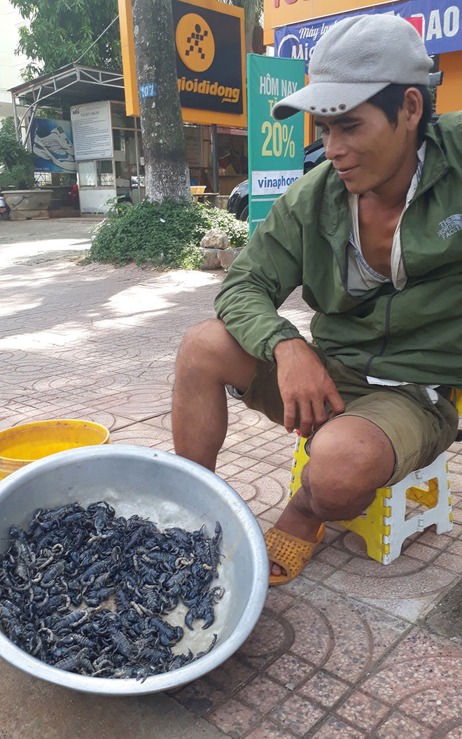 Bắt một con bọ cạp to hơn ngón tay cái lên đưa cho tôi xem, ông Hiền tiết lộ: “Cỡ con này bán cho khách lẻ có thể được 10.000 đồng, chứ nhà hàng mua thì họ ép giá chừng 4.000 - 5.000 đồng thôi”.