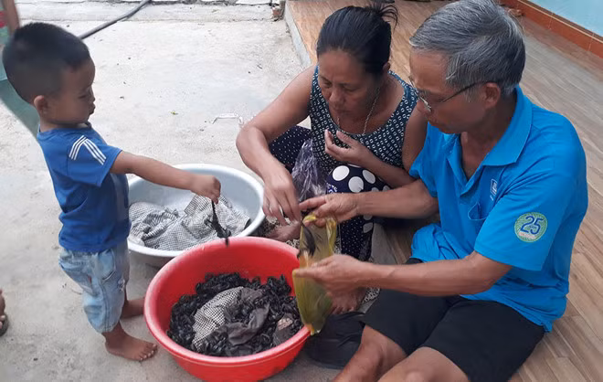 Ông Hiền và vợ phân loại bọ cạp để bán. Ảnh: Quang Viên