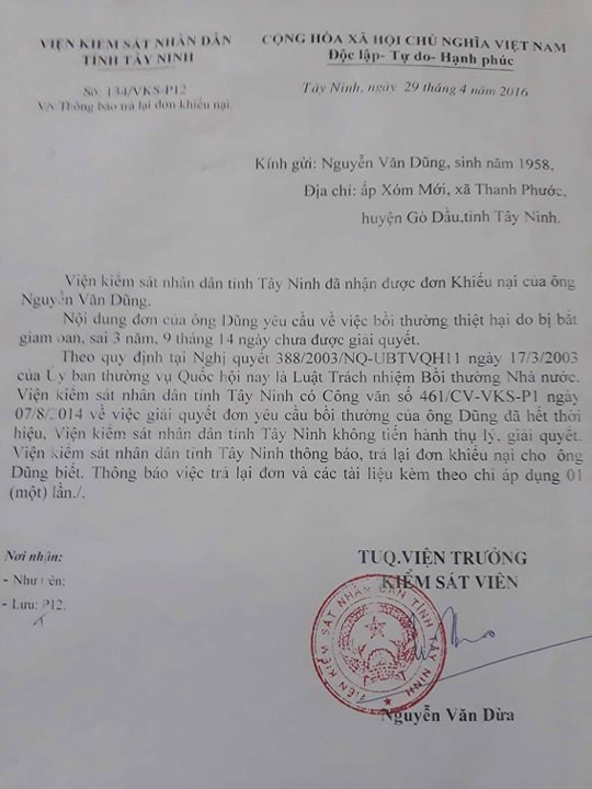 Ngày 25.5.1983, ông Dũng trở lại đơn vị để trình báo sự việc đồng thời xin được phục hồi chế độ như nhưng quân nhân khác. Tuy nhiên, đơn vị từ chối giải quyết với lý do không biết ông bị bắt oan nên đã cắt quân số, thông báo về địa phương là ông đào ngũ. Đồng thời người ở đơn vị cấp giấy, hướng dẫn ông khiếu nại ở Viện KSND tỉnh Tây Ninh. Nhưng khi đó chưa có Luật Trách nhiệm bồi thường của nhà nước nên cơ quan này không giải quyết.