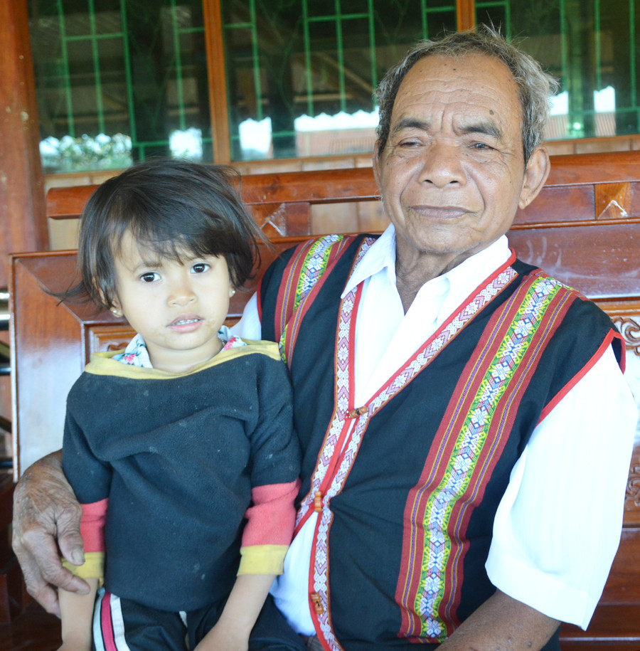 | Ông Rơ Châm Kớp và cháu nội. Ảnh: H.C |