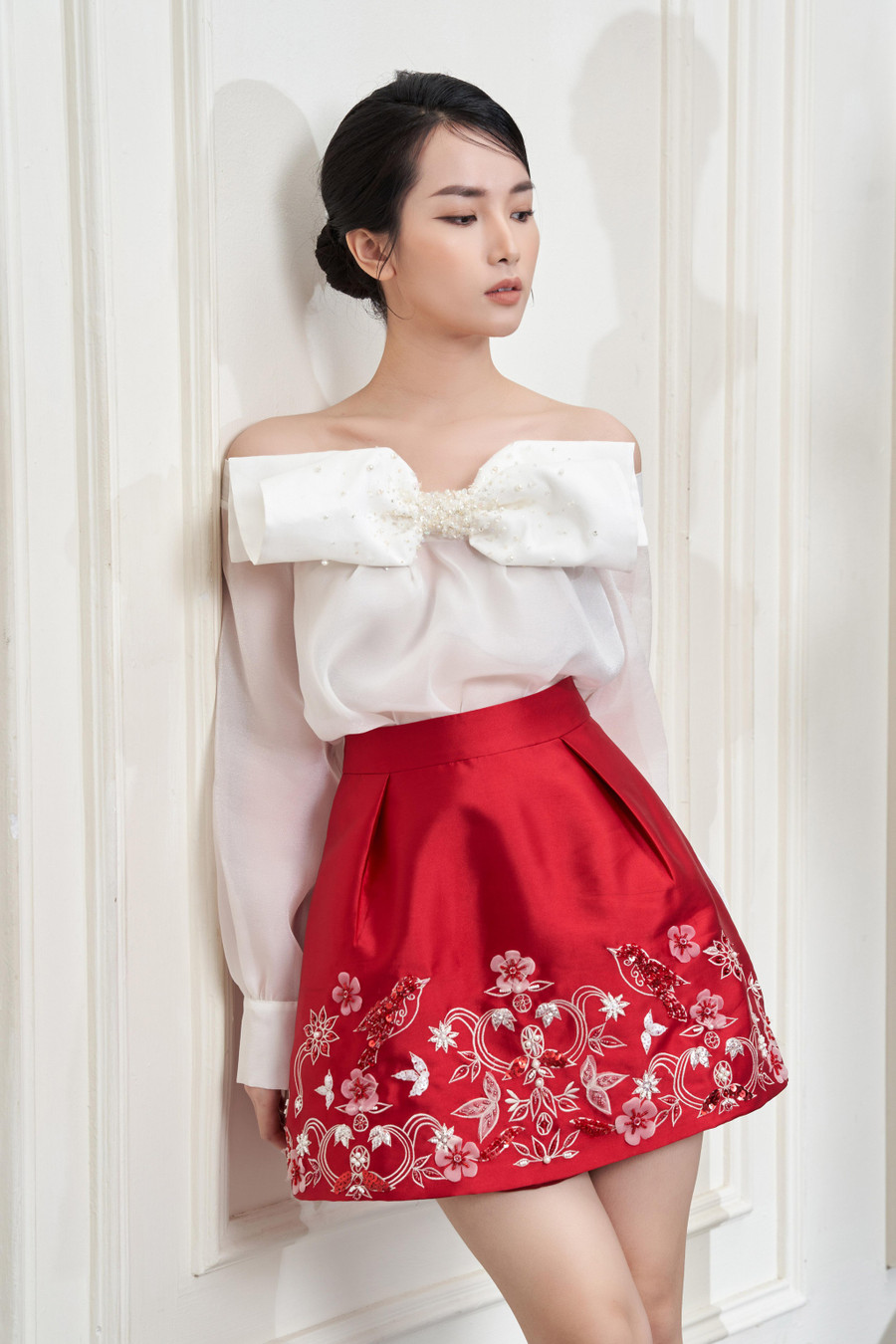 | Tone đỏ chủ đạo là burgundy quyến rũ, kết hợp với chất liệu tweed, taffeta sang trọng đã toát lên sự trẻ trung thời thượng và thu hút. |