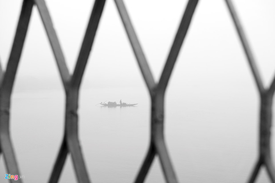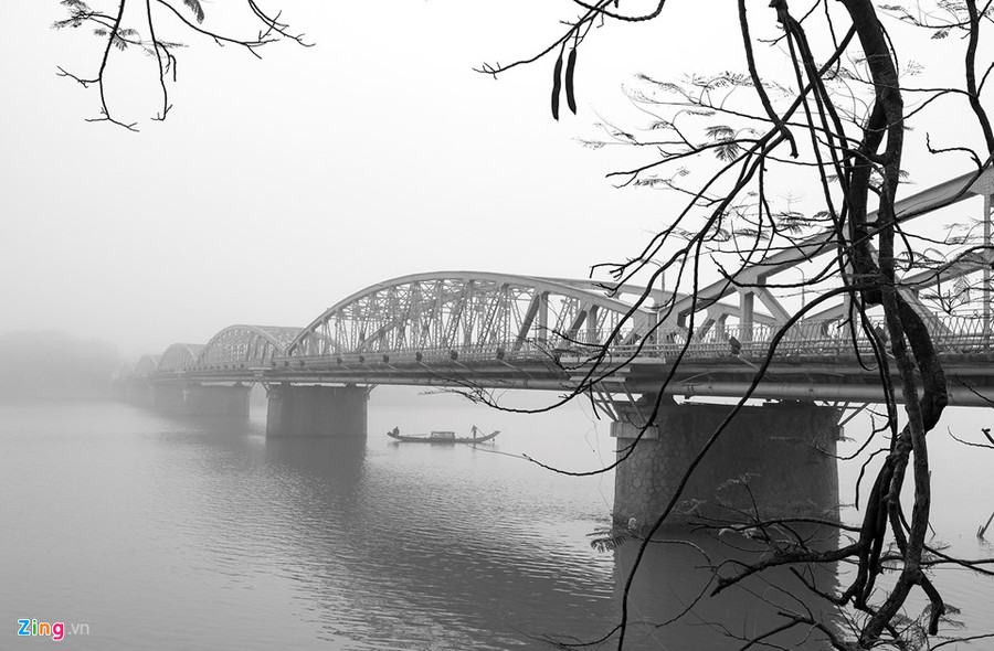 Cầu Trường Tiền như thường lệ hiện lên lãng mạn với làn sương mờ cùng con thuyền của ngư dân đánh bắt cá nhẹ trôi trên sông Hương.