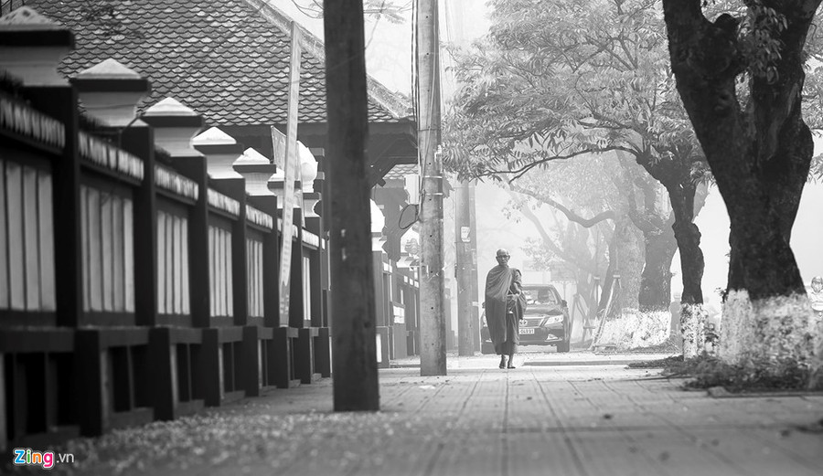 Một nhà sư đi khất thực trong buổi sớm.