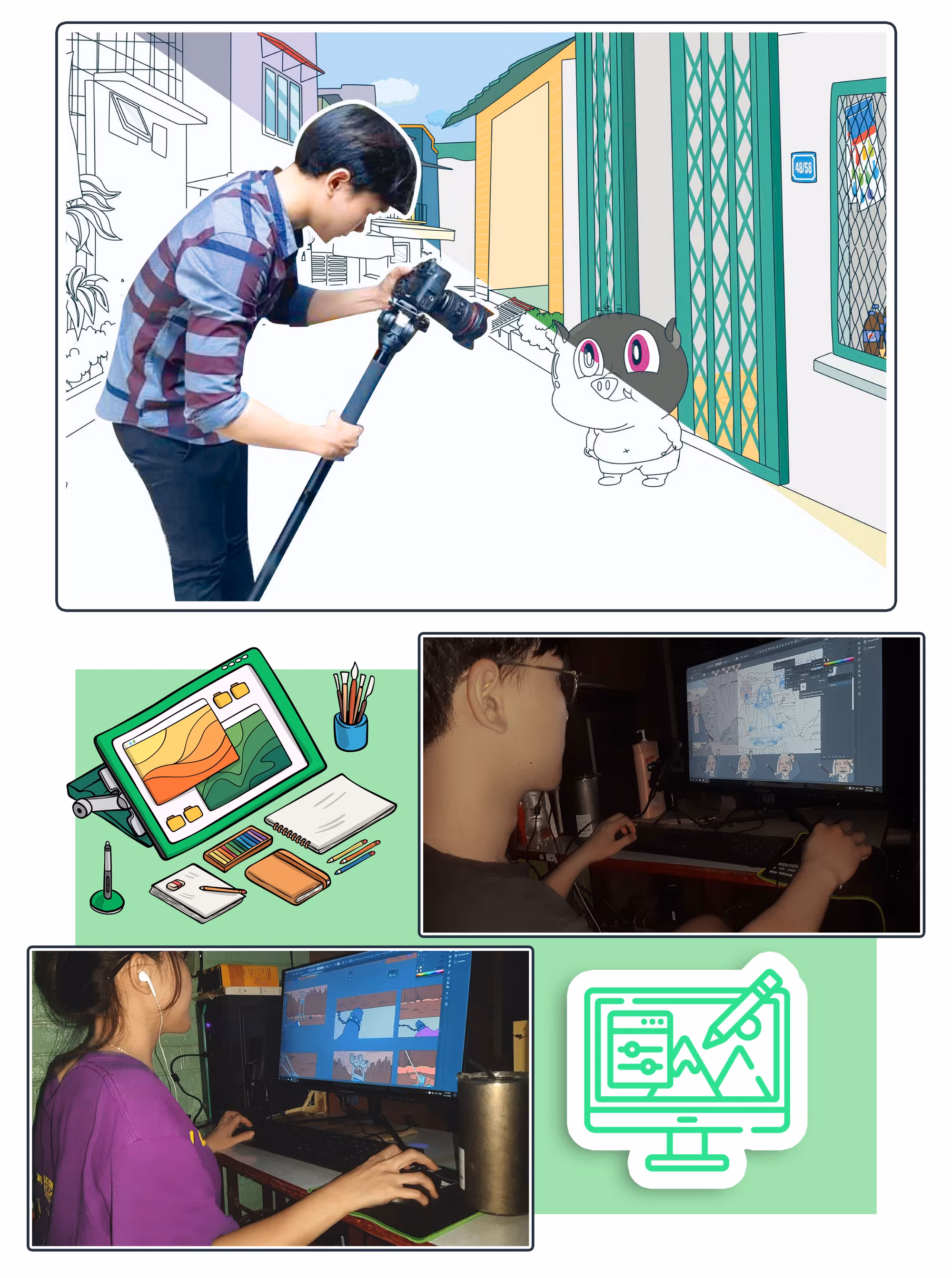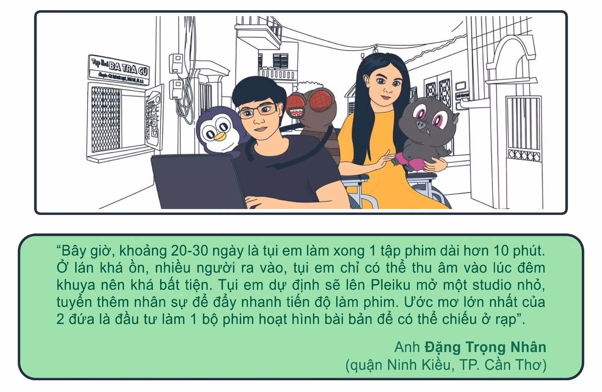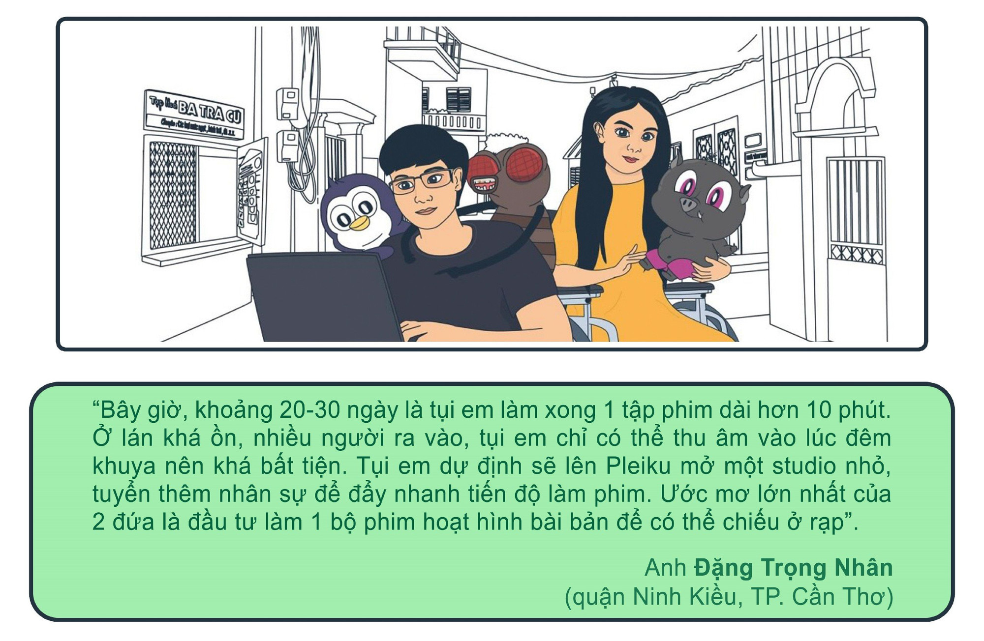 Và, chiếc lán đã trở thành “xưởng phim mini”. Từ đây, Hảo và Nhân đã cho ra đời những thước phim hoạt hình hấp dẫn. Những nét bút tài hoa, sự hóm hỉnh, nhạy bén với giới trẻ đã giúp phim hoạt hình “Heo Đen” dần thu hút được đông đảo người xem. Ngoài nhân vật chính Heo Đen, cả 2 sáng tạo ra thêm các nhân vật ngộ nghĩnh từ các con vật khác như: ruồi, chim cánh cụt, hà mã, chó… hay nhân vật ông Ba bán tạp hóa như chính cái lán mà cả 2 đang ở. Vừa lên kịch bản, vừa vẽ, vừa làm chuyển động, hậu kỳ… Hảo và Nhân kiêm lồng tiếng cho tất cả nhân vật của mình.
