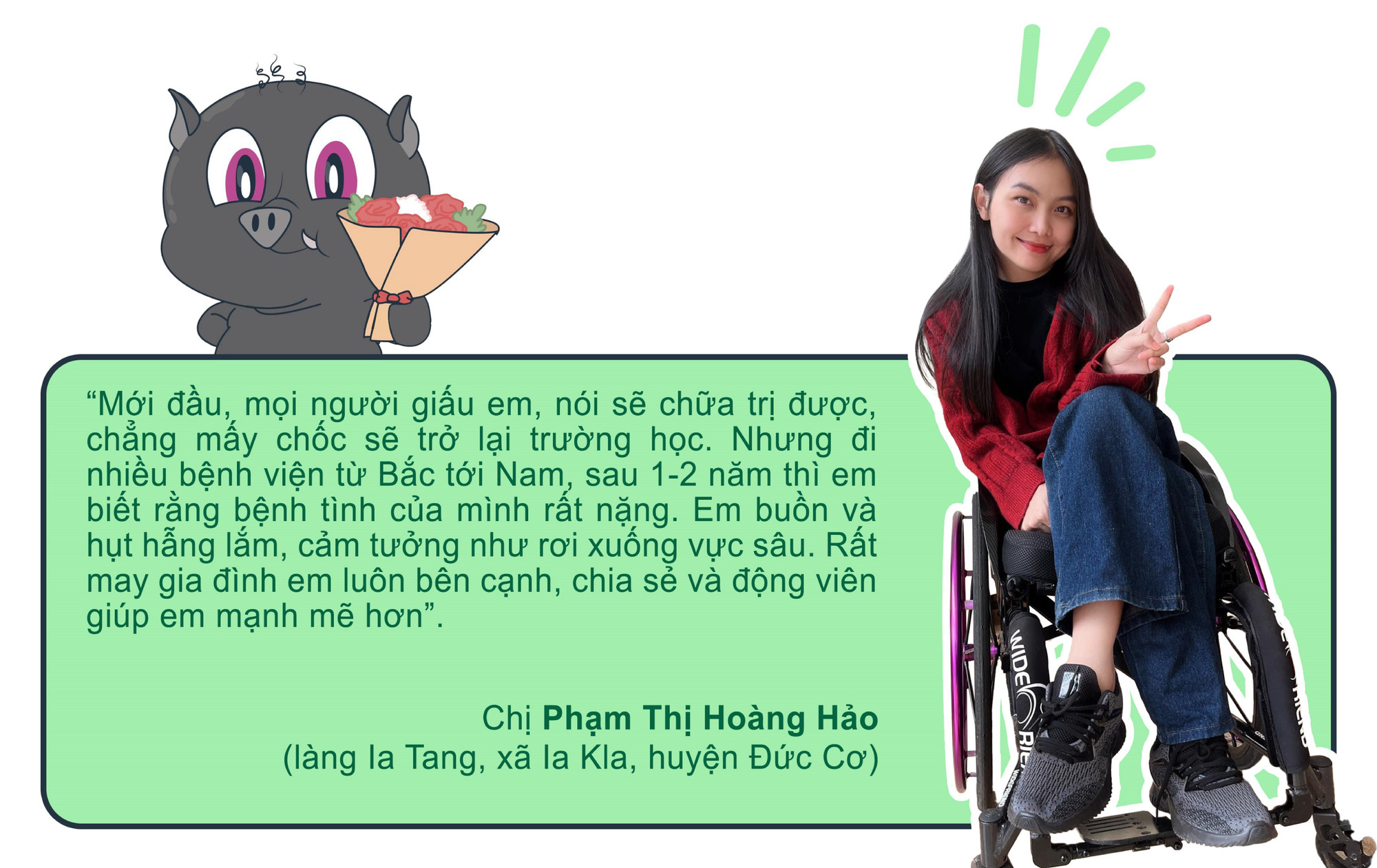 Phạm Thị Hoàng Hảo chia sẻ: Năm lên 4 tuổi, em bị xe máy tông phải. Vết thương không quá nặng, chỉ bị trầy xước ngoài da. Song, chấn thương âm ỉ trong cột sống thì phải tới năm em học lớp 11 Trường THPT Lê Hoàn mới được phát hiện. Đó là một buổi sáng, khi thức dậy, em đã không thể tự đứng lên được nữa. Được đưa đi thăm khám ở nhiều nơi, các bác sĩ chẩn đoán em bị chấn thương tủy sống nhưng không được phát hiện và chữa trị kịp thời.