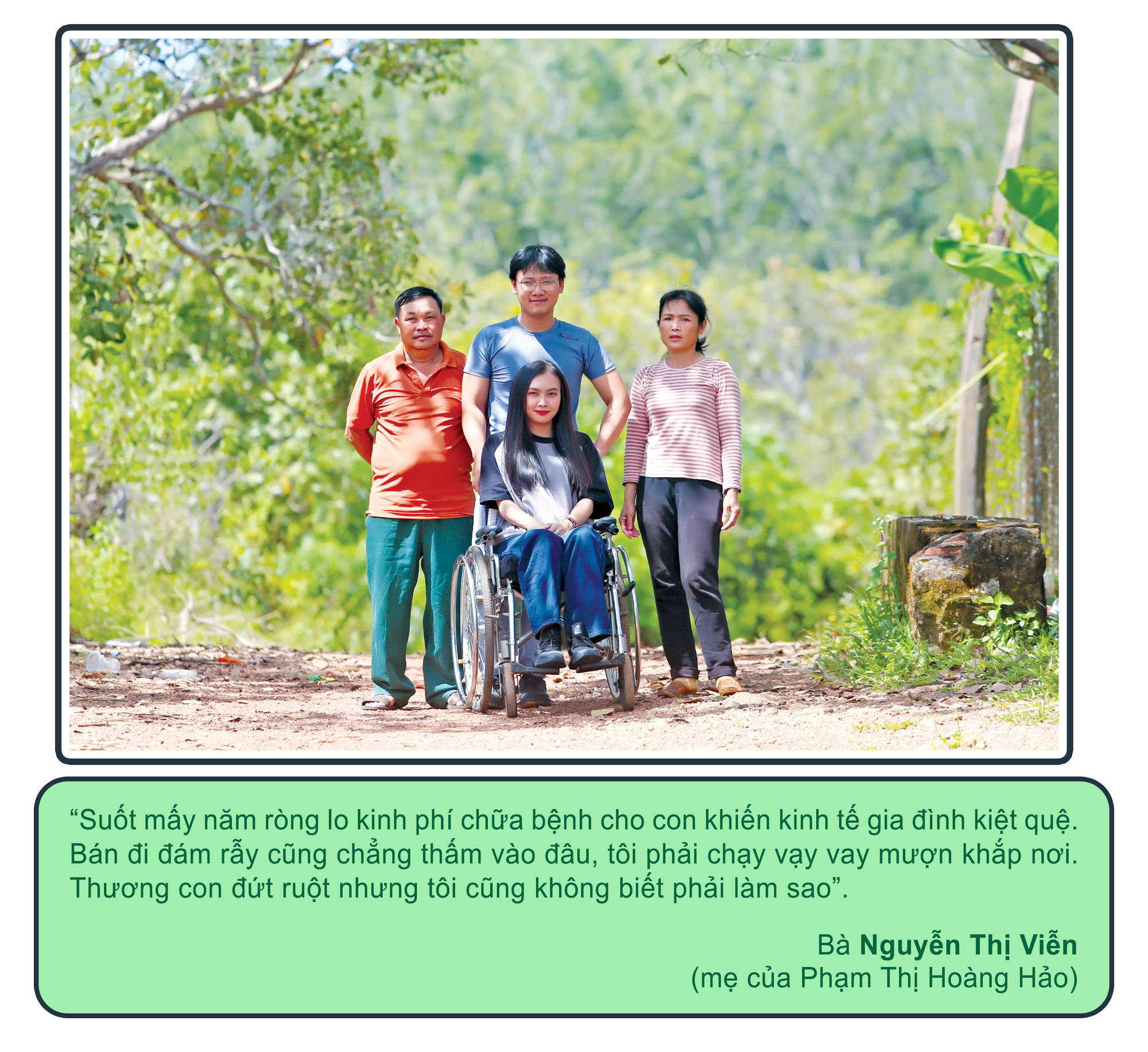 Cha mẹ Hảo vốn là công nhân Công ty TNHH một thành viên 74 (Binh đoàn 15). Đồng lương công nhân chỉ đủ trang trải cuộc sống gia đình và chăm lo cho 4 người con đang tuổi ăn tuổi học. Khi con gái mắc bệnh và đột nhiên bị liệt, bà Nguyễn Thị Viễn nhiều đêm khóc cạn nước mắt.