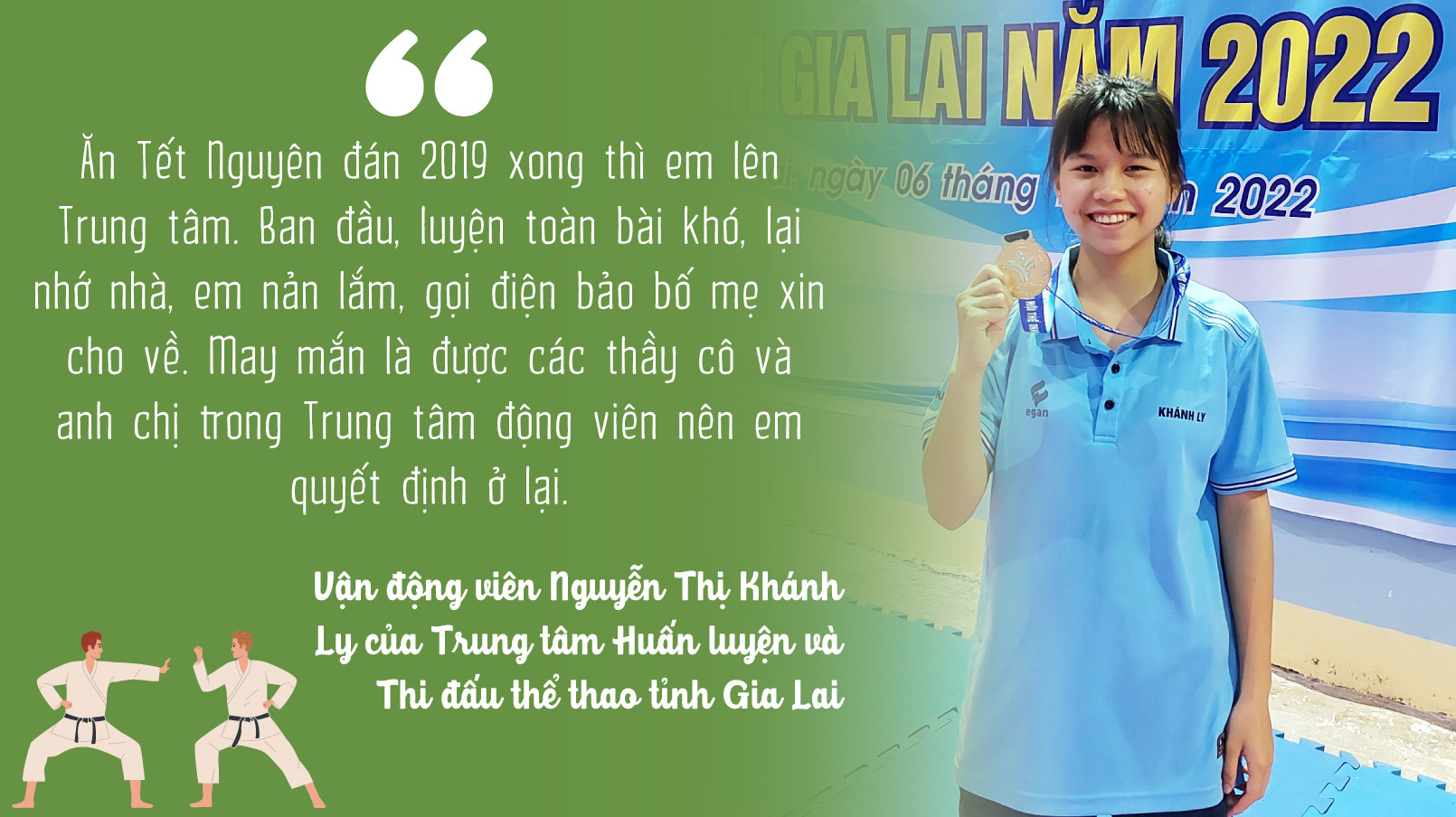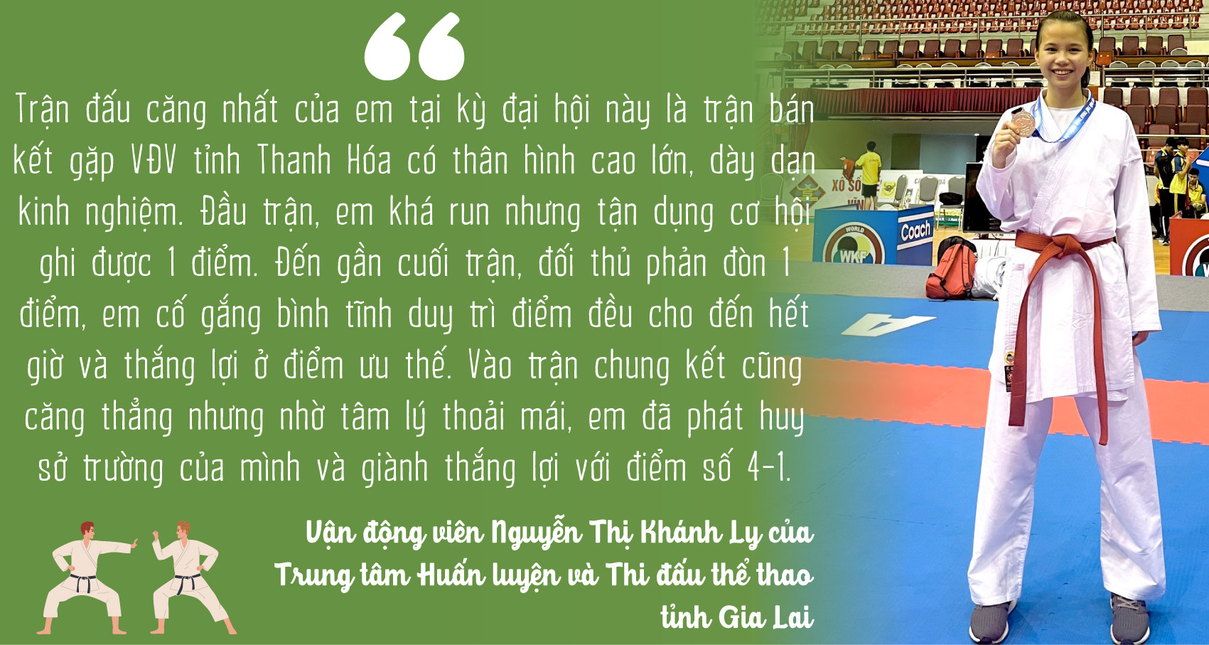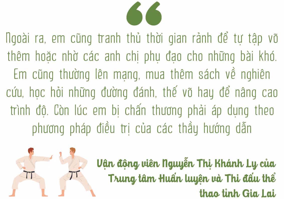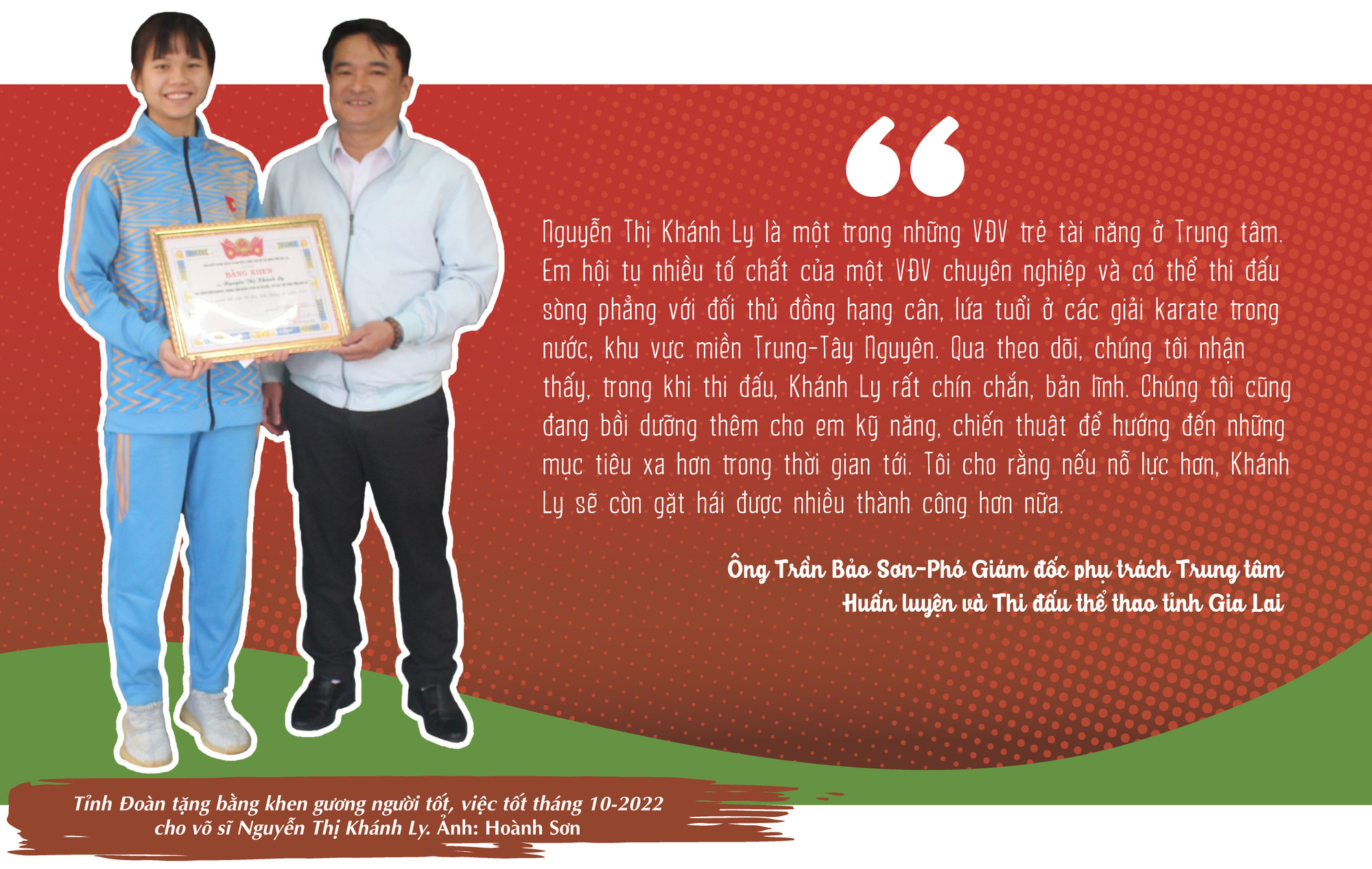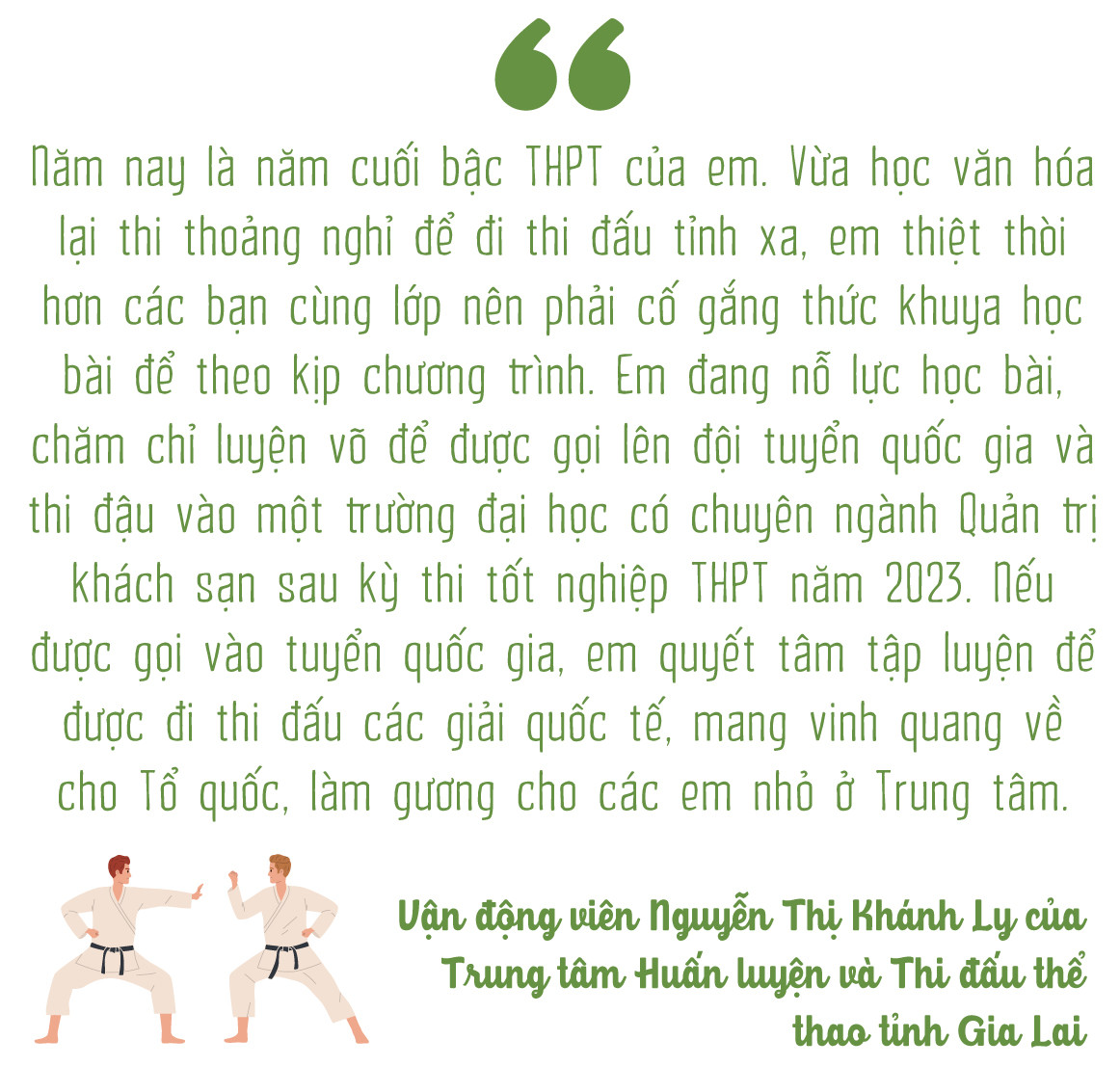 Ở Trung tâm Huấn luyện và Thi đấu thể thao tỉnh, võ sĩ Nguyễn Thị Khánh Ly không chỉ giỏi võ mà còn học giỏi các môn văn hóa. Đối với võ thuật, từ năm 2019 đến nay, cô gái đến từ Chư Păh liên tục gặt hái thành tích cao. Đó là 3 tấm huy chương đồng, bạc ở Giải Vô địch trẻ Karate Quốc gia 2019, 2020, 2022; huy chương vàng Giải Vô địch Karate Cúp Quốc gia diễn ra tại TP. Huế. Đặc biệt, Khánh Ly vừa giành huy chương vàng hạng 47 kg môn karate tại Đại hội Thể thao toàn quốc lần thứ IX-2022. Còn với việc học, năm lớp 10 và 11, Khánh Ly đều đạt danh hiệu học sinh giỏi. Hiện em đang ôn luyện để bước vào kỳ thi kết thúc học kỳ I lớp 12 ở Trung tâm Giáo dục thường xuyên tỉnh. Chia sẻ bí quyết “2 giỏi”, Khánh Ly bộc bạch: “Từ khi lên Trung tâm đến nay, em xác định tinh thần là muốn đạt được thành công như các anh chị đi trước thì phải ngủ ít lại, chăm chỉ hơn. Sau thời gian cố định luyện võ theo lịch của đội, em dành nhiều thời gian ôn tập và đi học thêm các môn văn hóa nữa. Em thường đi ngủ muộn, dậy sớm hơn mọi người. Những hôm được nghỉ về thăm gia đình, em cũng tranh thủ dậy sớm luyện võ, học bài rồi mới phụ bố mẹ việc nhà”.