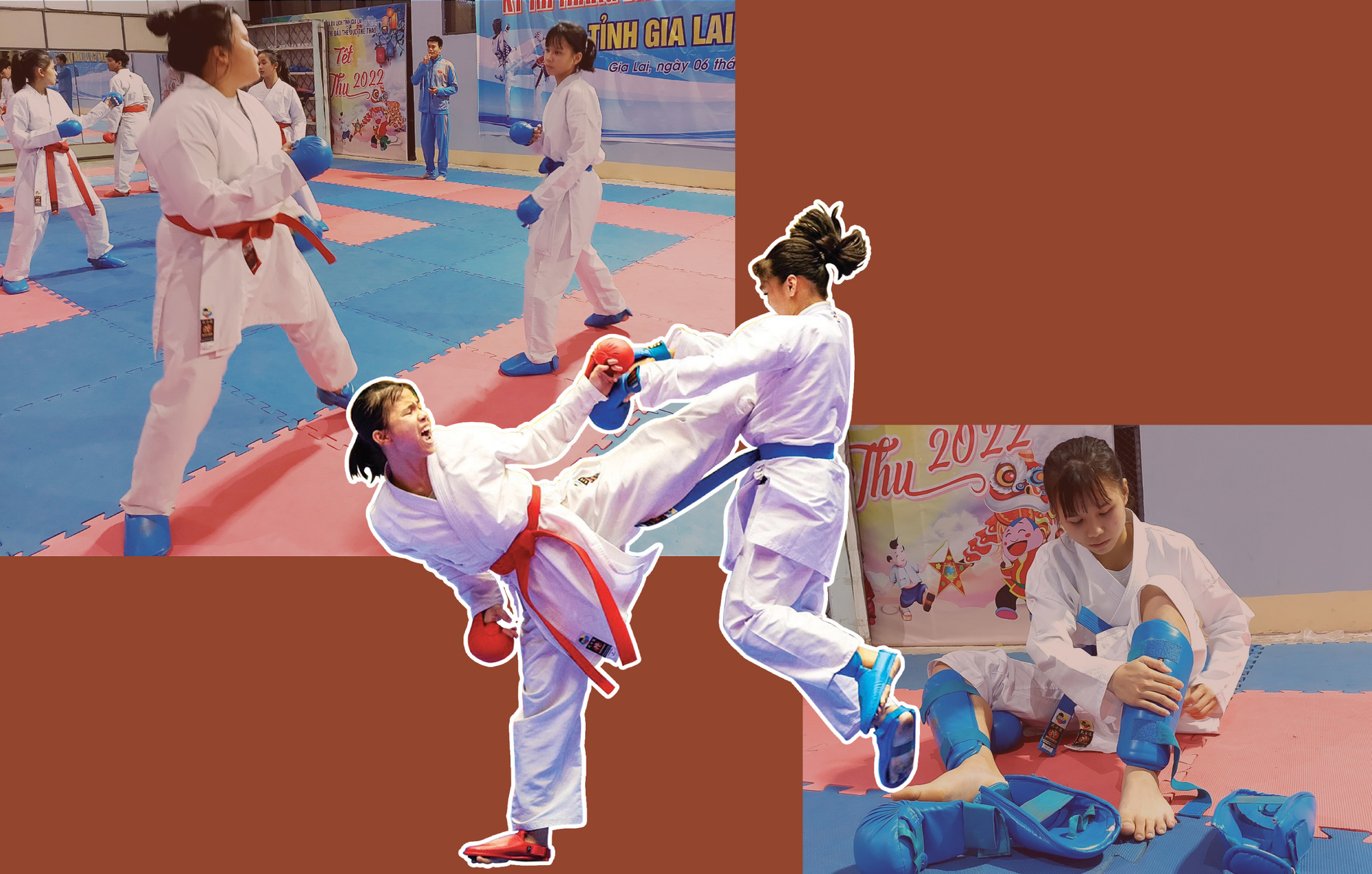 Chập tối, tại Trung tâm Huấn luyện và Thi đấu thể thao tỉnh, võ sĩ trẻ Nguyễn Thị Khánh Ly tiếp chuyện chúng tôi. Nhắc chuyện bén duyên với môn võ có nguồn gốc từ Nhật Bản, Khánh Ly nói: “Trong nhà chỉ có mình em học võ. Lúc em còn nhỏ, ở xã Nghĩa Hòa (huyện Chư Păh) nở rộ phong trào học võ karate. Thấy bạn bè đi học, em cũng thích nên hay mở ti vi xem. Khi 8 tuổi, một người bạn hàng xóm rủ nên em xin đi học ở Câu lạc bộ (CLB) Karate Trung Nguyên của thầy Phan Nguyên Trị để rèn luyện sức khỏe và được bố mẹ đồng ý. Hồi mới tập võ, do chưa quen, toàn thân ê ẩm, nhiều khi đau đến trào nước mắt nhưng em gắng chịu đựng. Dần dà, càng học càng mê, nhất là khi đi thi đấu giải tỉnh và đạt huy chương”.