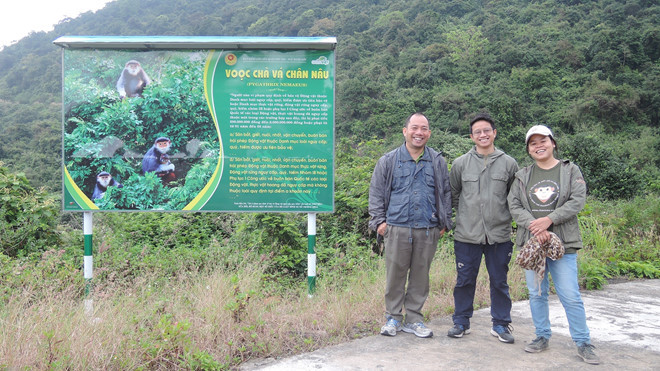 Lê Thị Trang (bìa phải) tại khu vực bảo tồn rừng ở bán đảo Sơn Trà (Đà Nẵng). ẢNH: AN QUÂN