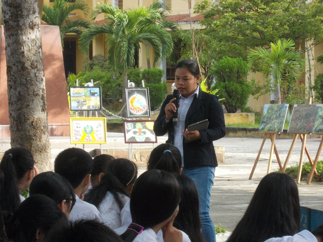Lê Thị Trang trong chương trình truyền thông bảo vệ đa dạng sinh học thực hiện tại một trường học