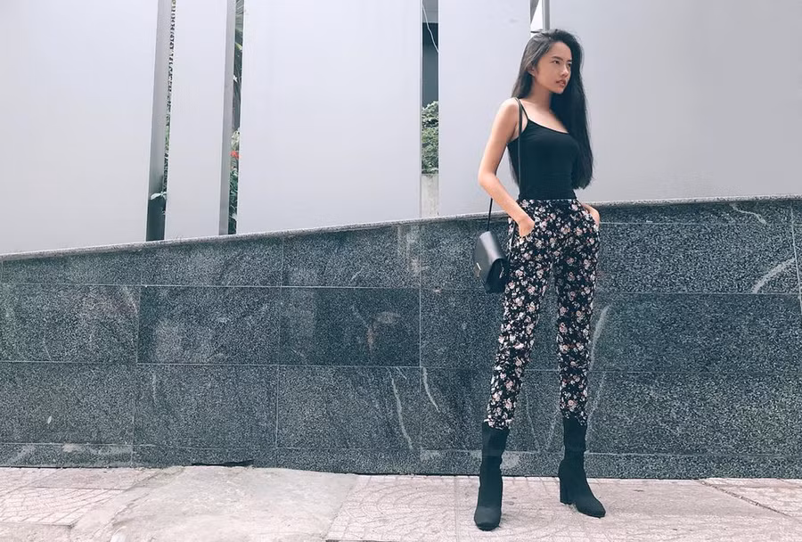 Váy hai dây có lẽ là item quen thuộc nhất với Thanh Vy, khi nó xuất hiện xuyên suốt cùng cô từ sự kiện, đường phố cho đến trong các bộ ảnh thời trang. Lần này, người đẹp sinh năm 1995 chọn kết hợp cùng quần hoa và boots cao hầm hố, cân bằng lại sự đơn điệu của áo hai dây cơ bản.